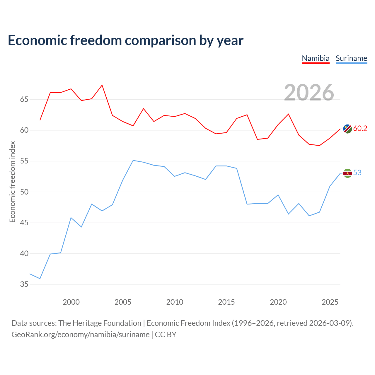 The Economic Freedom Index for Namibia is 60.2, ranking 95/197, compared to 53 for Suriname, ranking 143/197. The chart above displays a comparison of annual changes in economic freedom indexes.