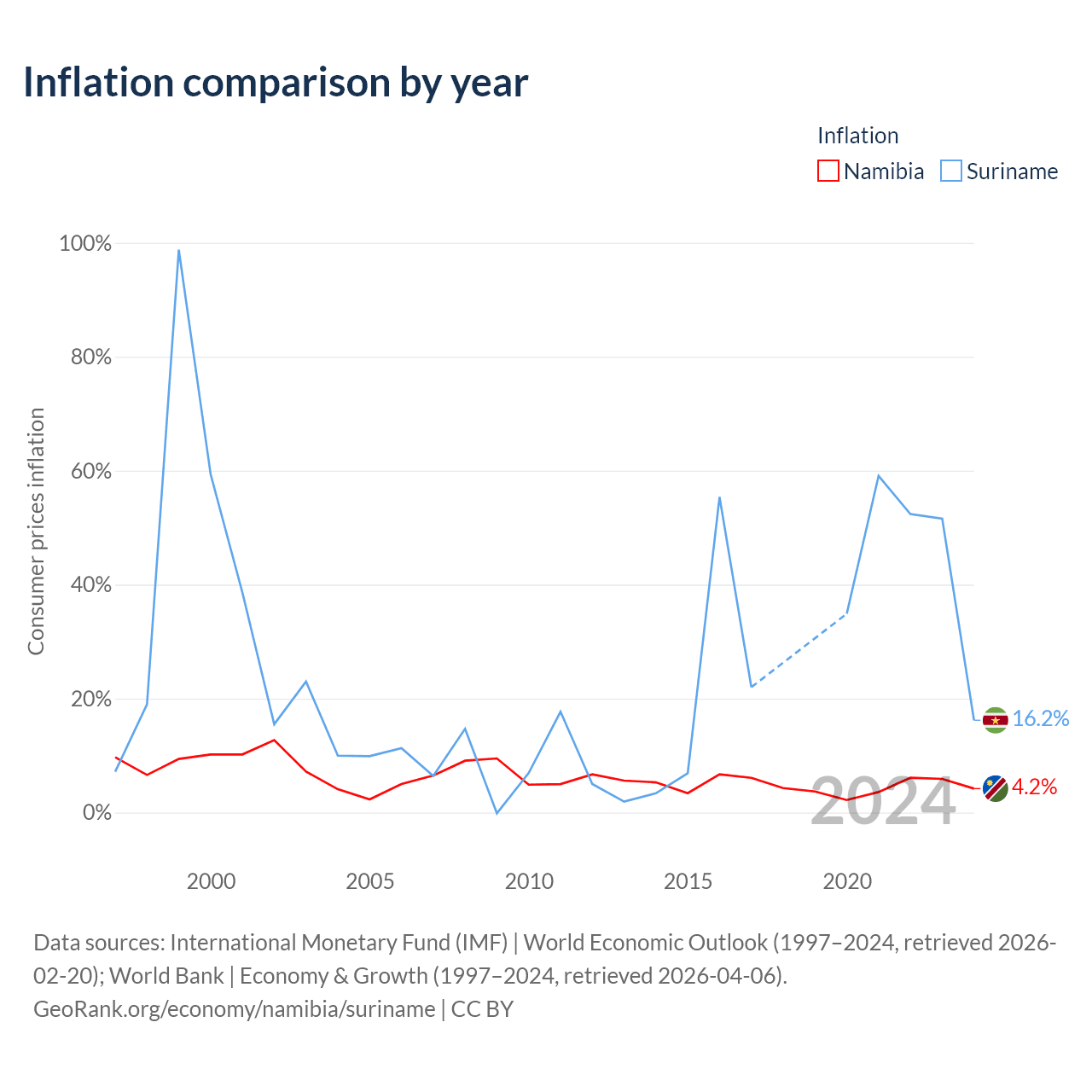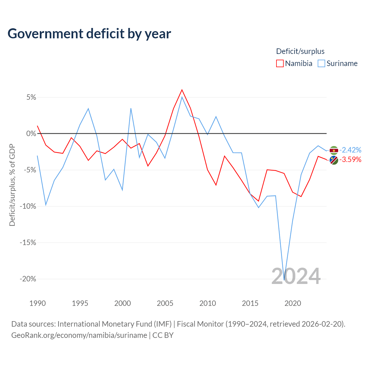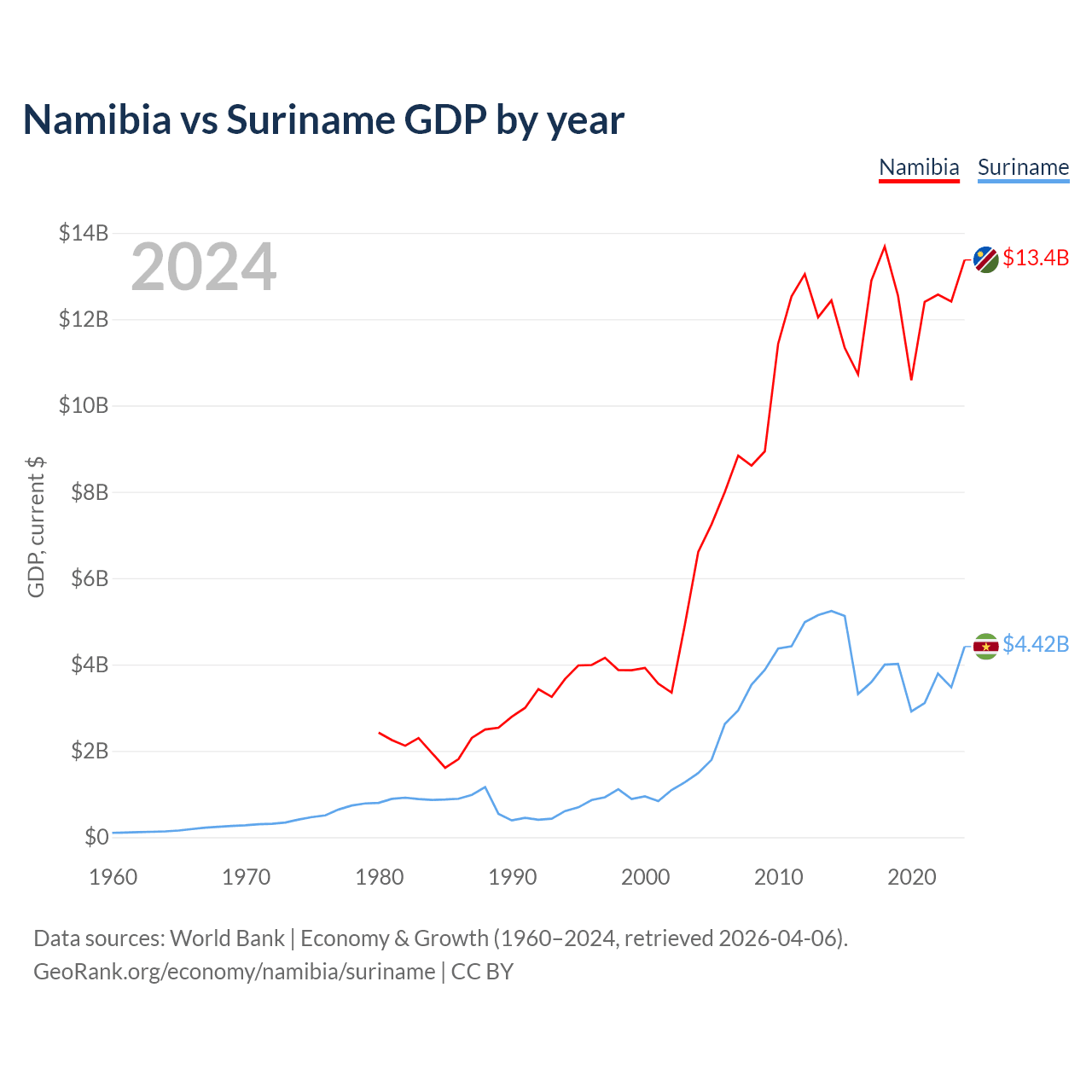 Namibia has a GDP of $13.4B compared to $4.42B for Suriname, ranking 147/197 and 164/197 by economy size, respectively.