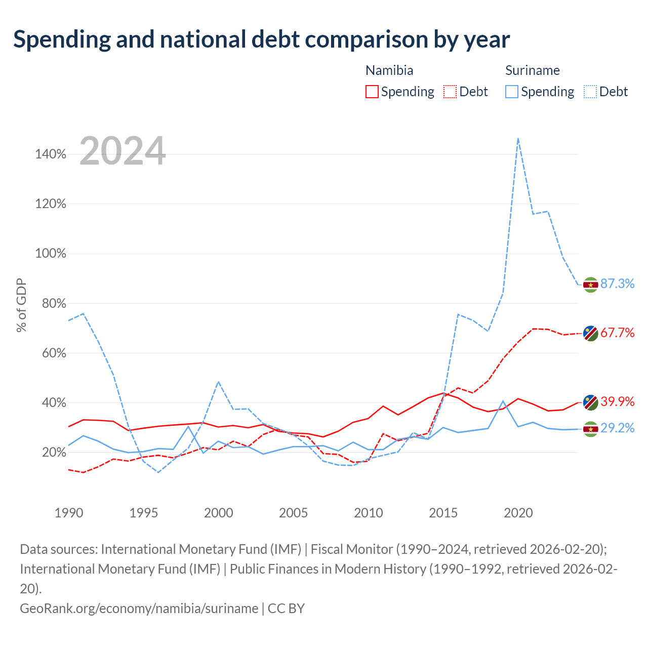 Namibia has $9.05B in government debt (67.7% of GDP), compared to $3.86B (87.3% of GDP) in Suriname.