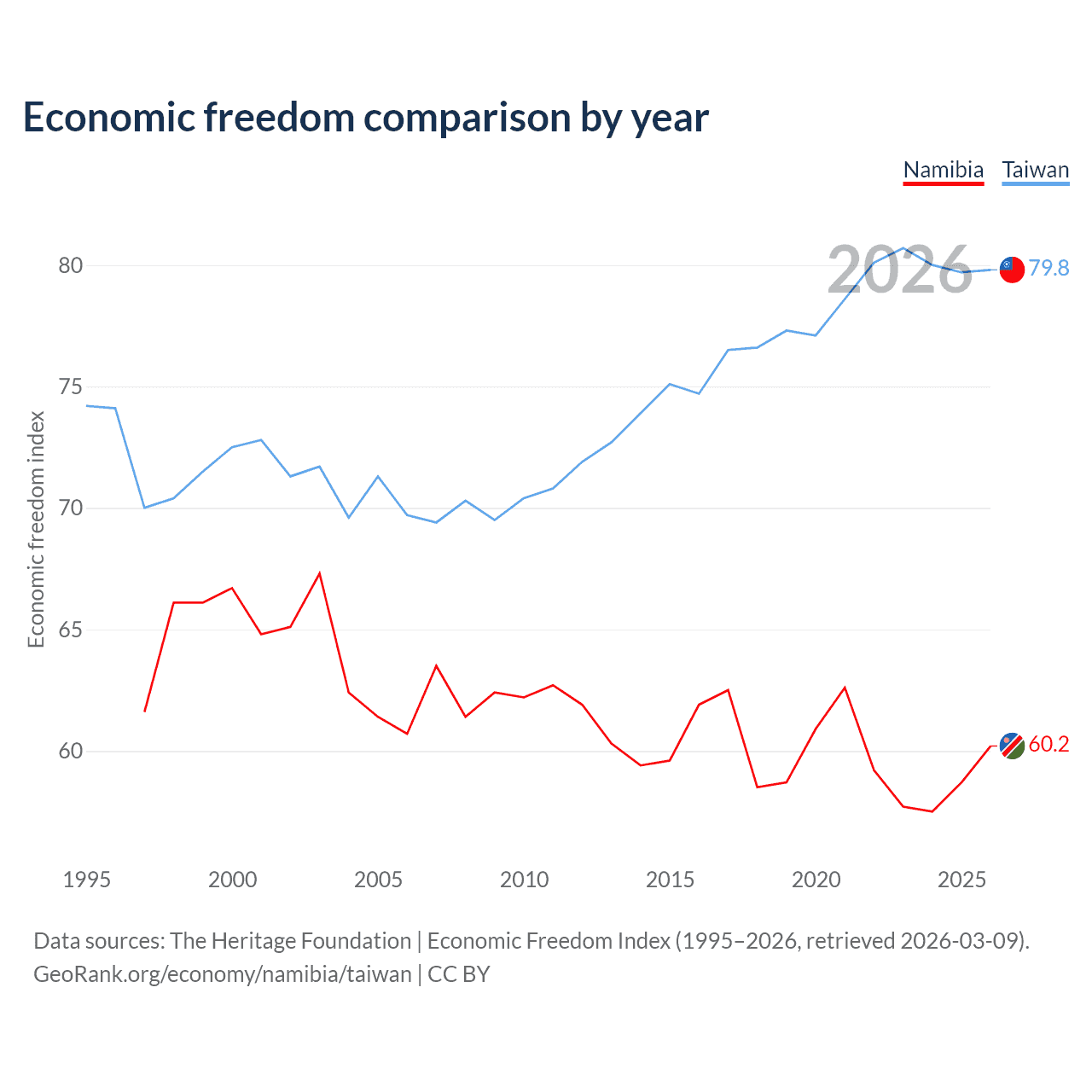 The Economic Freedom Index for Namibia is 60.2, ranking 95/197, compared to 79.8 for Taiwan, ranking 6/197. The chart above displays a comparison of annual changes in economic freedom indexes.