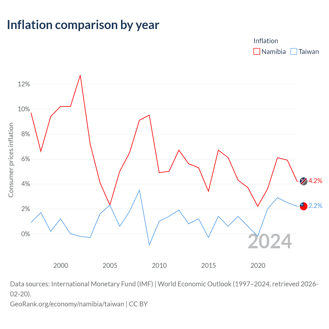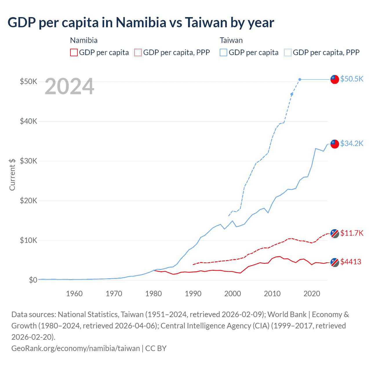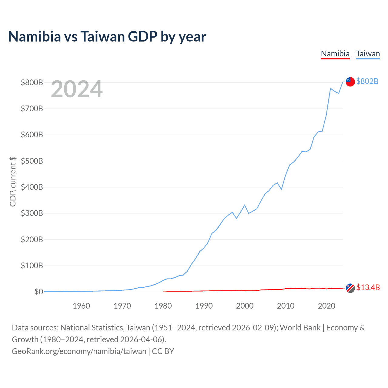 Namibia has a GDP of $13.4B compared to $802B for Taiwan, ranking 147/197 and 22/197 by economy size, respectively.