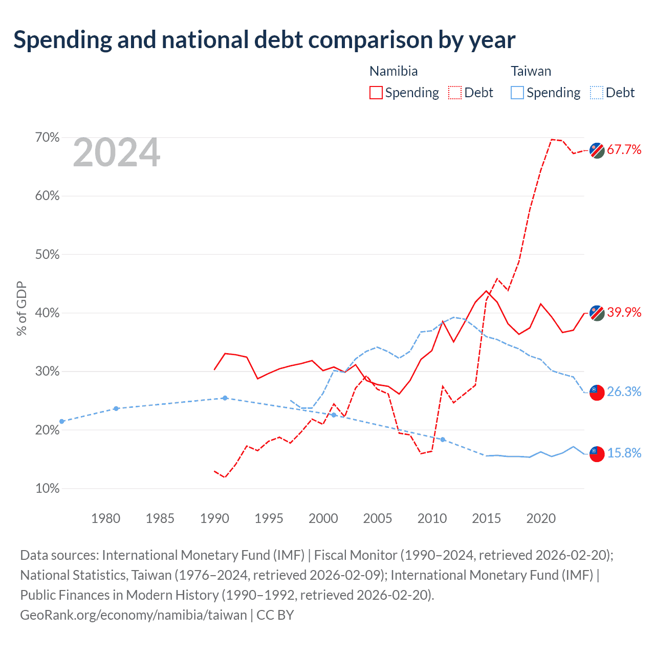 Namibia has $9.05B in government debt (67.7% of GDP), compared to $211B (26.3% of GDP) in Taiwan.