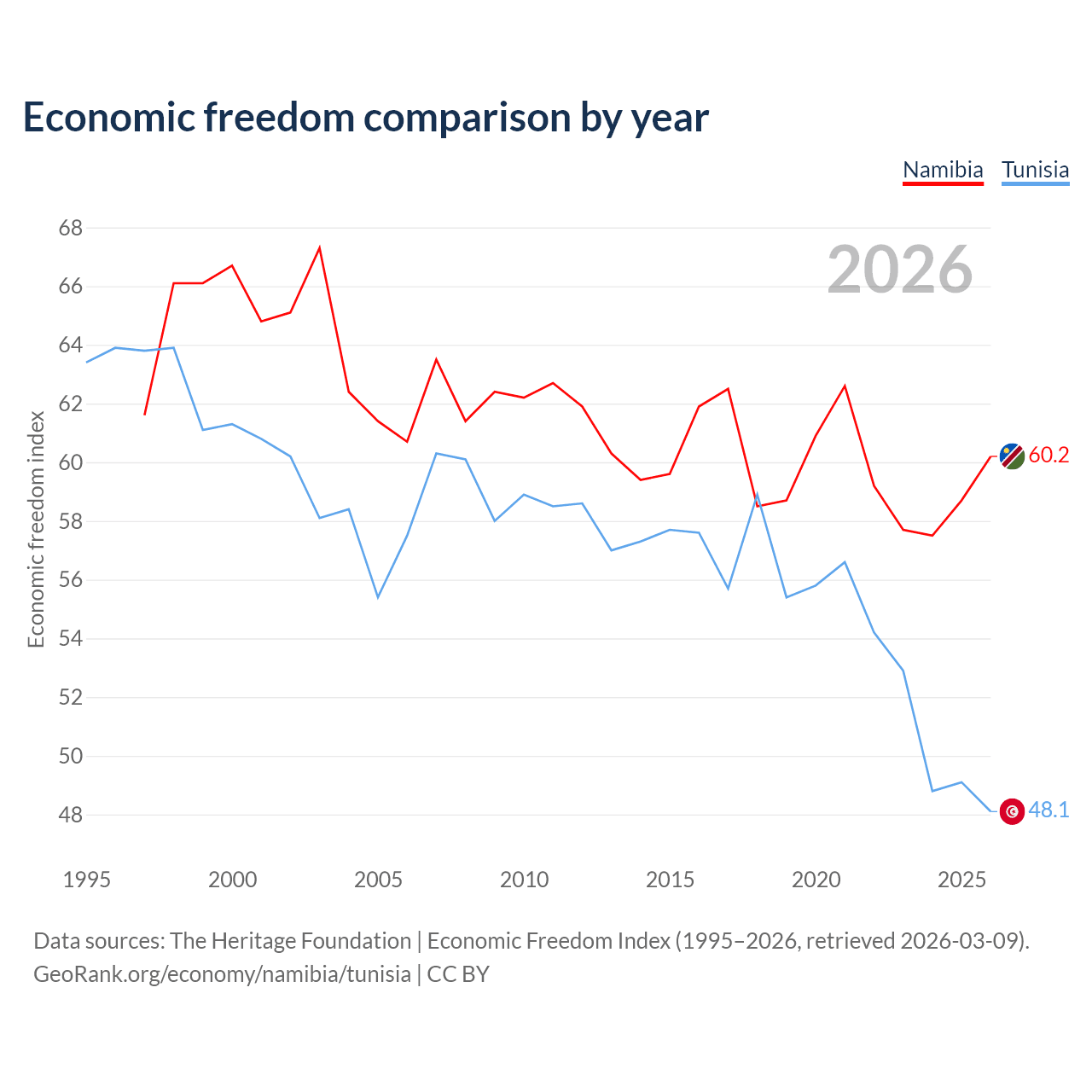 The Economic Freedom Index for Namibia is 60.2, ranking 95/197, compared to 48.1 for Tunisia, ranking 172/197. The chart above displays a comparison of annual changes in economic freedom indexes.
