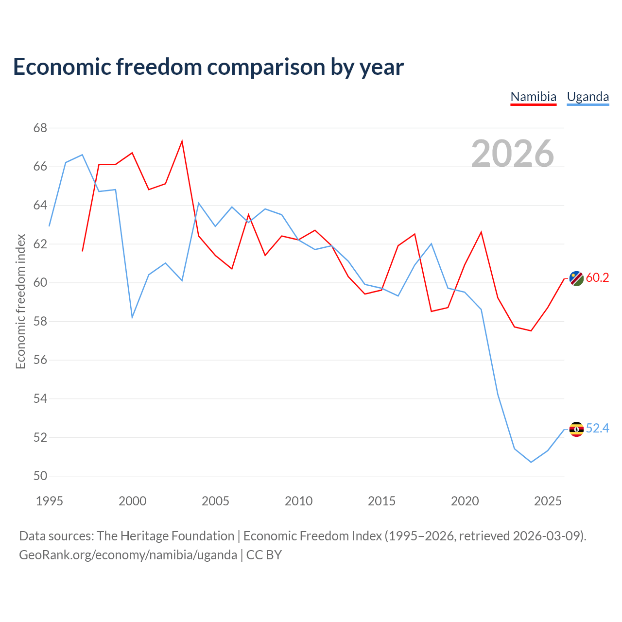 The Economic Freedom Index for Namibia is 60.2, ranking 95/197, compared to 52.4 for Uganda, ranking 149/197. The chart above displays a comparison of annual changes in economic freedom indexes.