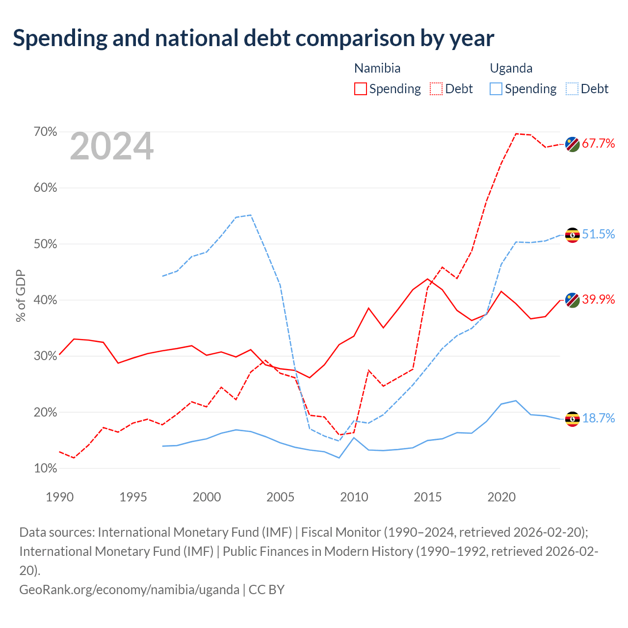 Namibia has $9.05B in government debt (67.7% of GDP), compared to $27.8B (51.5% of GDP) in Uganda.