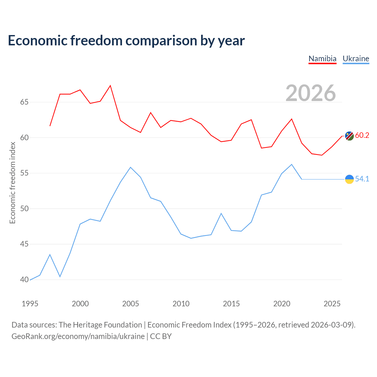 The Economic Freedom Index for Namibia is 60.2, ranking 95/197, compared to 54.1 for Ukraine, ranking 135/197. The chart above displays a comparison of annual changes in economic freedom indexes.