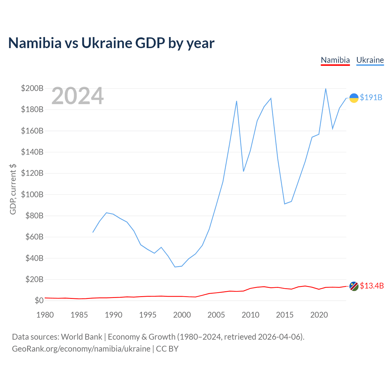 Namibia has a GDP of $13.4B compared to $191B for Ukraine, ranking 147/197 and 57/197 by economy size, respectively.
