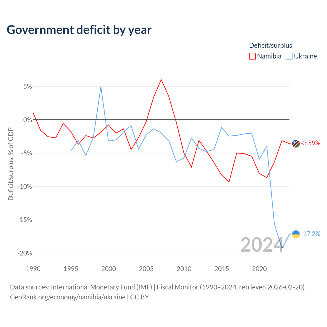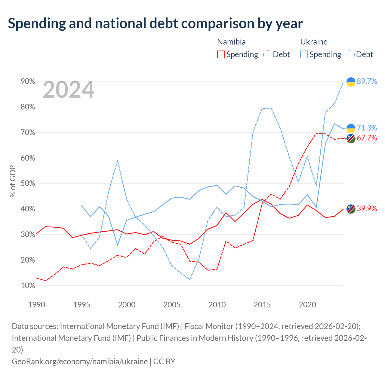 Namibia has $9.05B in government debt (67.7% of GDP), compared to $171B (89.7% of GDP) in Ukraine.