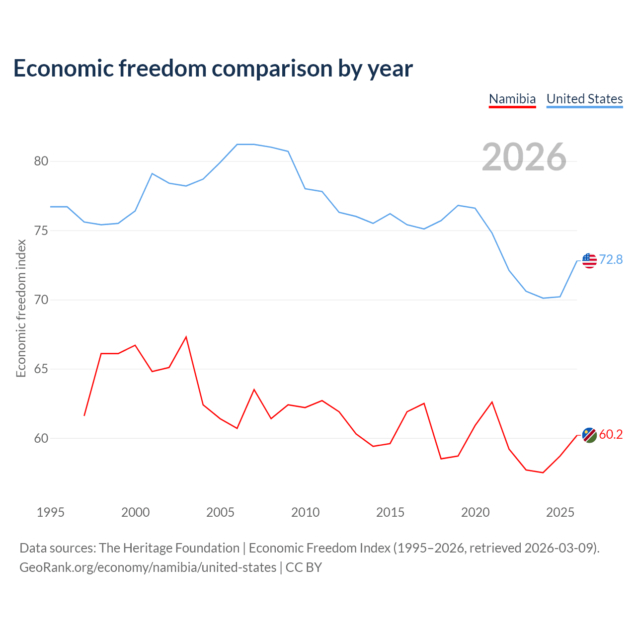 The Economic Freedom Index for Namibia is 60.2, ranking 95/197, compared to 72.8 for the United States, ranking 27/197. The chart above displays a comparison of annual changes in economic freedom indexes.