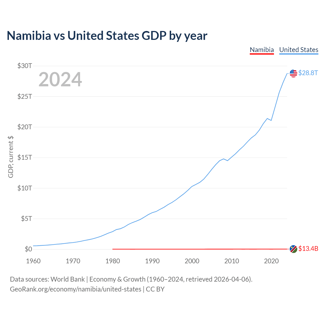 Namibia has a GDP of $13.4B compared to $28.8T for the United States, ranking 147/197 and 1/197 by economy size, respectively.