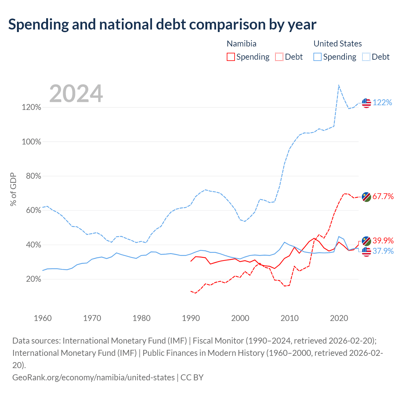 Namibia has $9.05B in government debt (67.7% of GDP), compared to $35.2T (122.3% of GDP) in the United States.