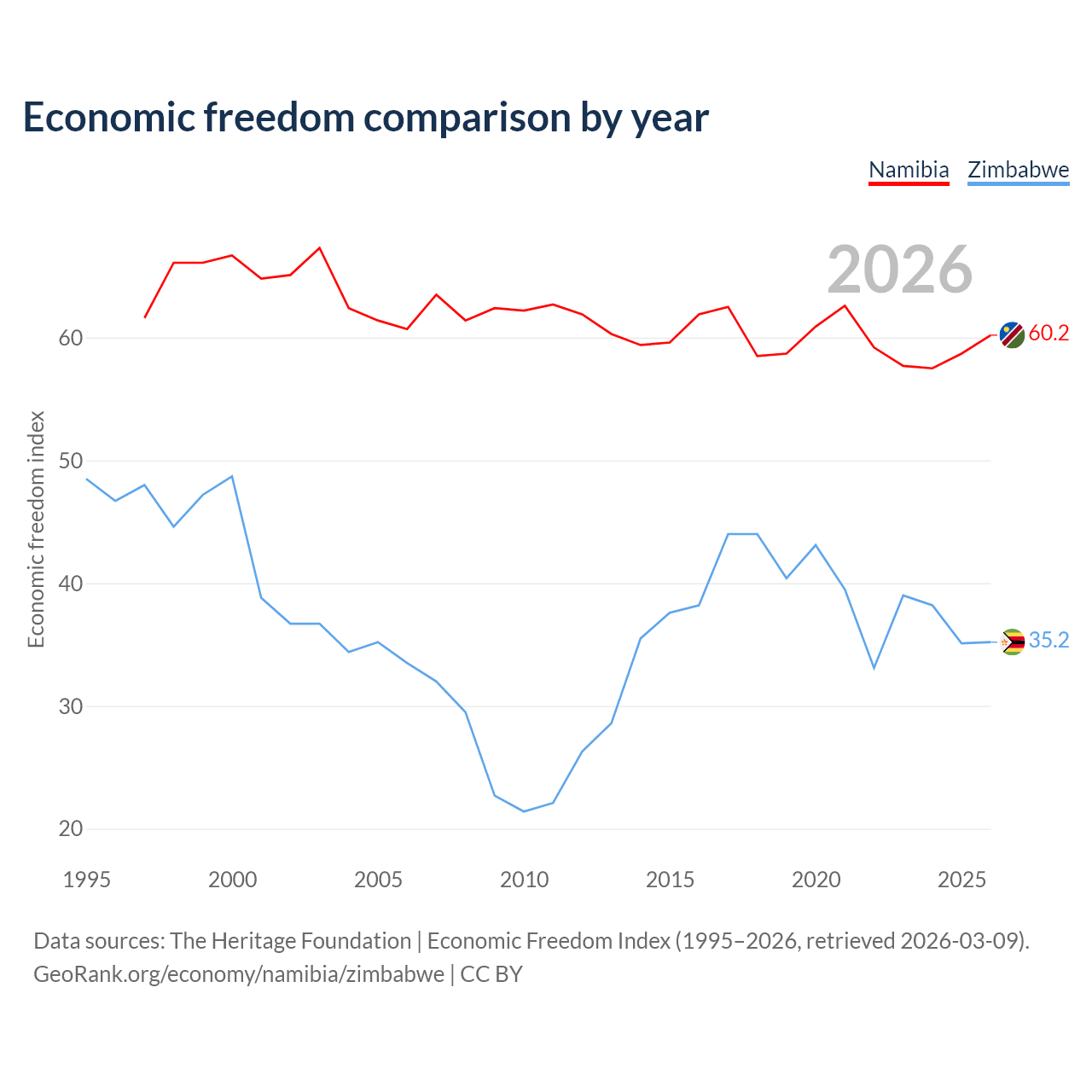 The Economic Freedom Index for Namibia is 60.2, ranking 95/197, compared to 35.2 for Zimbabwe, ranking 190/197. The chart above displays a comparison of annual changes in economic freedom indexes.