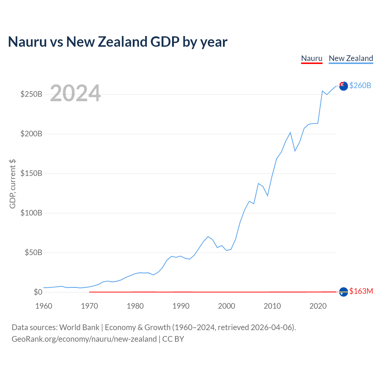 Nauru has a GDP of $163M compared to $260B for New Zealand, ranking 195/197 and 52/197 by economy size, respectively.