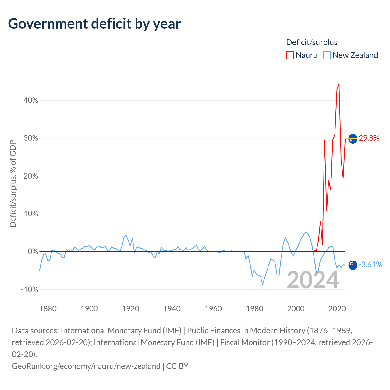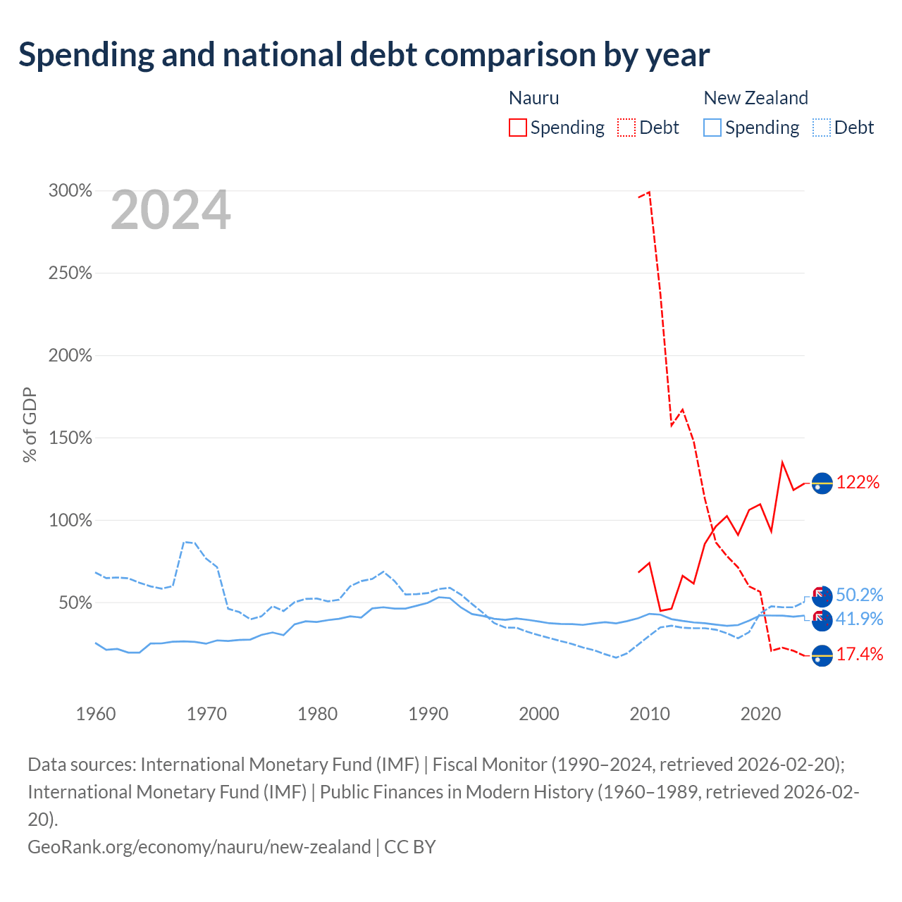 Nauru has $28.3M in government debt (17.4% of GDP), compared to $131B (50.2% of GDP) in New Zealand.