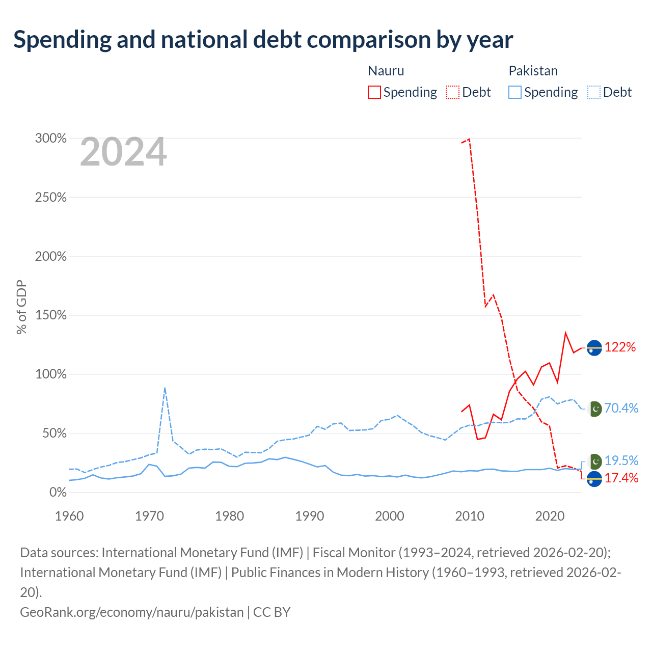 Nauru has $28.3M in government debt (17.4% of GDP), compared to $262B (70.4% of GDP) in Pakistan.