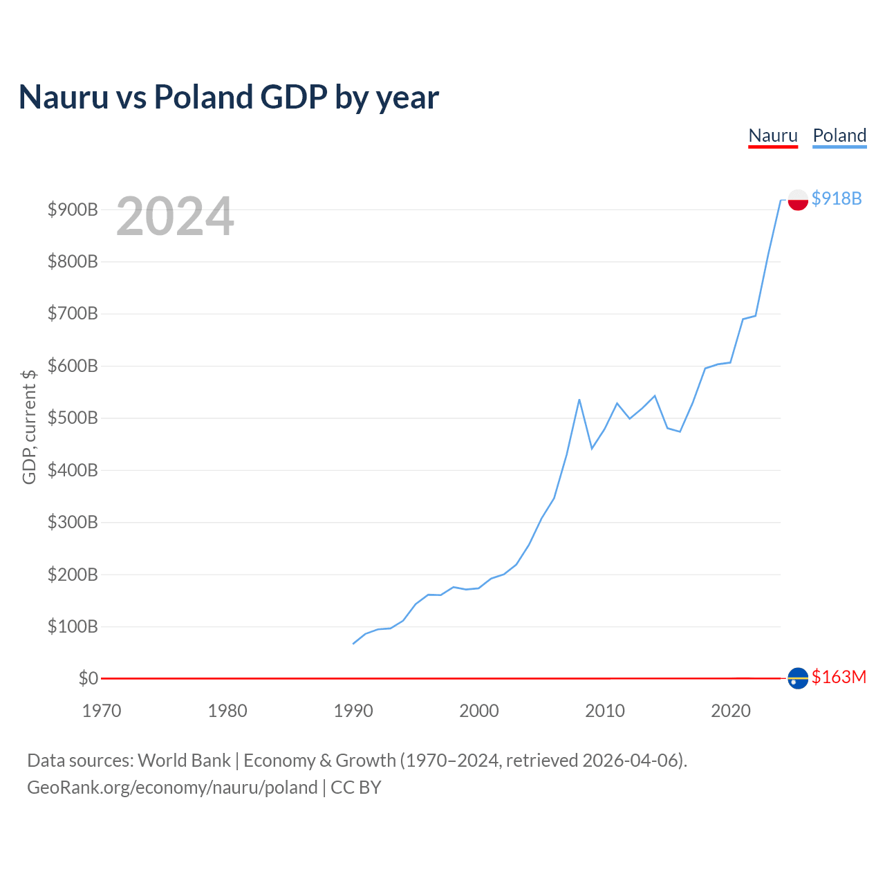 Nauru has a GDP of $163M compared to $918B for Poland, ranking 195/197 and 21/197 by economy size, respectively.