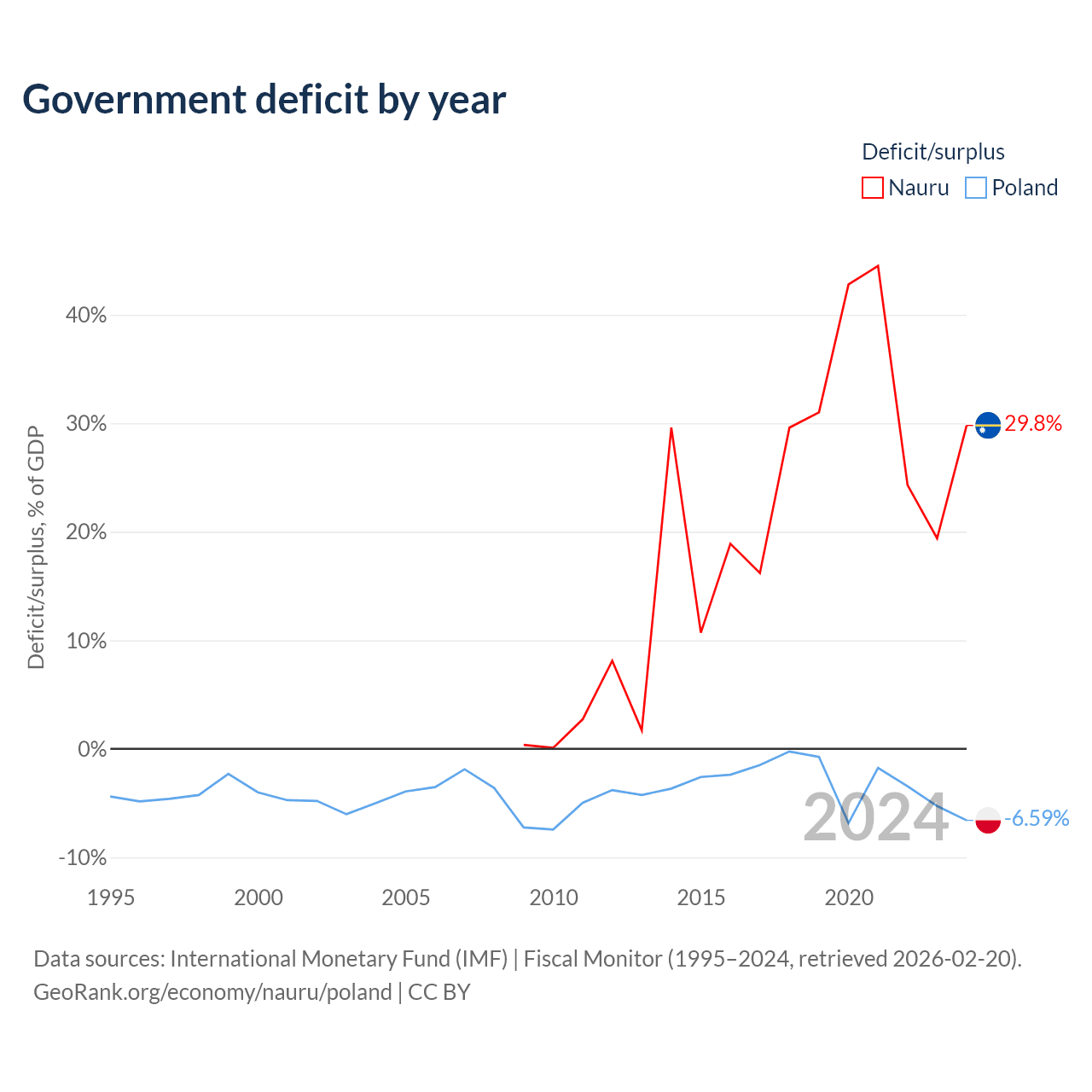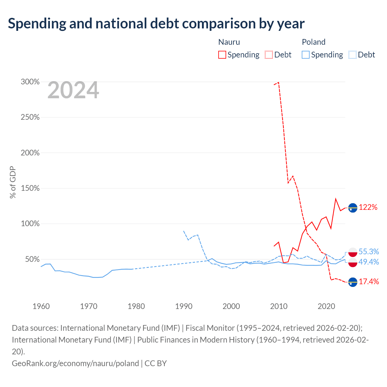 Nauru has $28.3M in government debt (17.4% of GDP), compared to $507B (55.3% of GDP) in Poland.