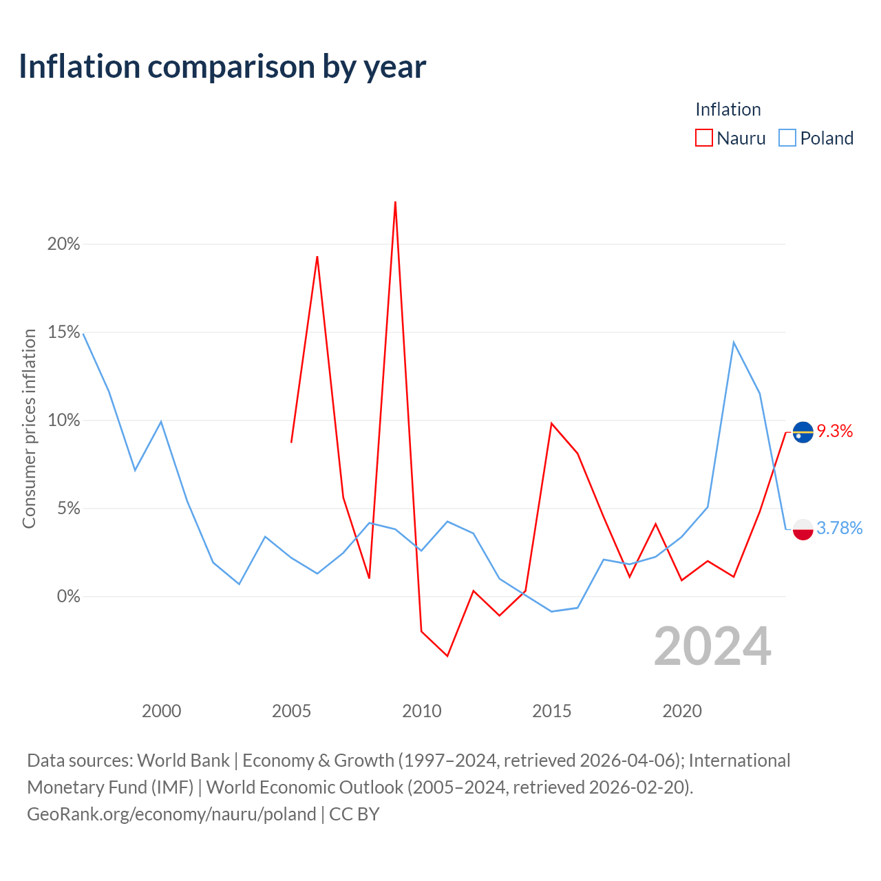 Over the past 20 years, Nauru has recorded an average annual inflation rate of 4.84%, compared with 3.4% in Poland. In 2024, inflation was 9.3% in Nauru and 3.78% in Poland.