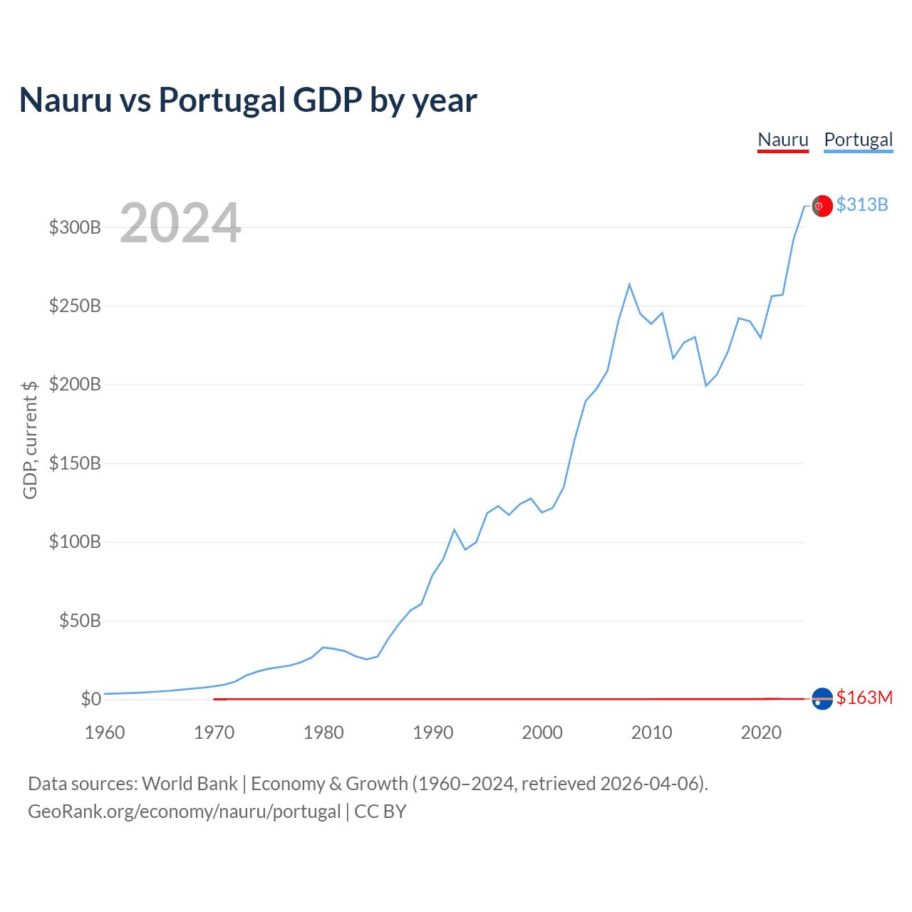 Nauru has a GDP of $163M compared to $313B for Portugal, ranking 195/197 and 46/197 by economy size, respectively.