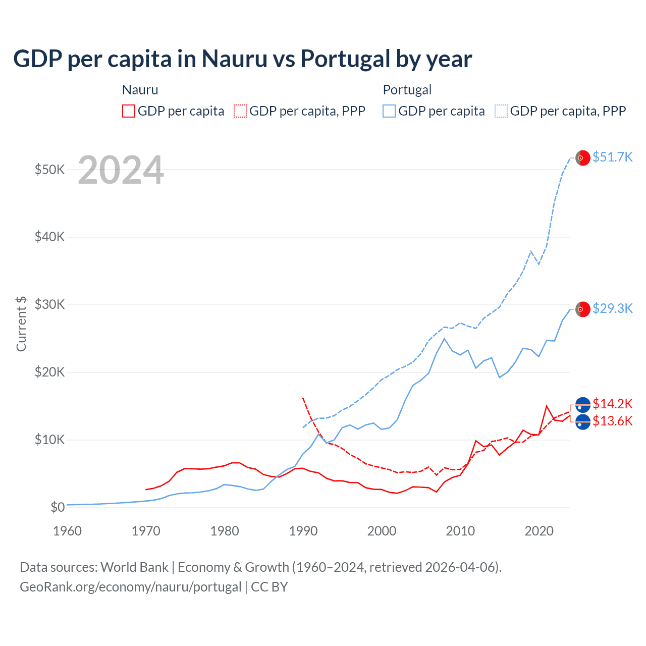 GDP per capita in Nauru vs Portugal by year