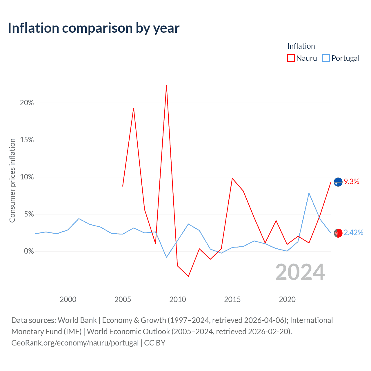 Over the past 20 years, Nauru has recorded an average annual inflation rate of 4.84%, compared with 1.85% in Portugal. In 2024, inflation was 9.3% in Nauru and 2.42% in Portugal.