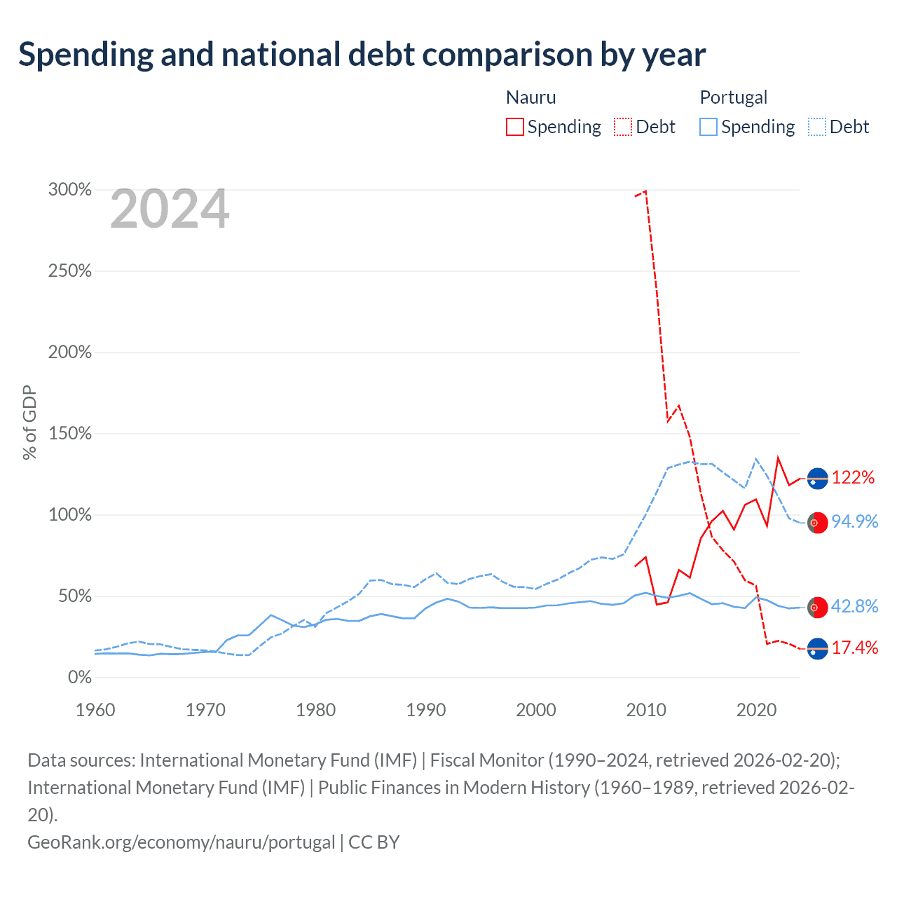Nauru has $28.3M in government debt (17.4% of GDP), compared to $297B (94.9% of GDP) in Portugal.