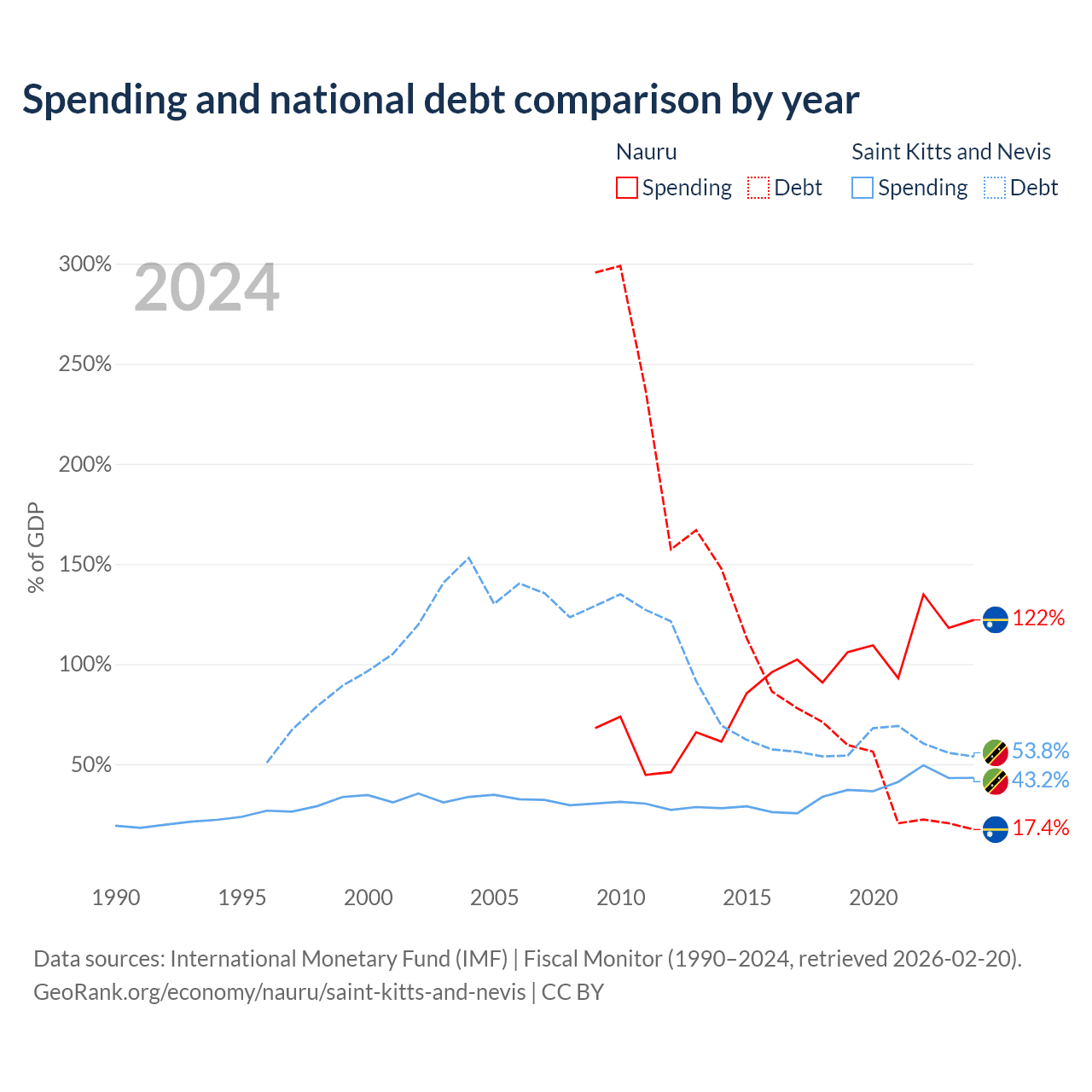 Nauru has $28.3M in government debt (17.4% of GDP), compared to $604M (53.8% of GDP) in Saint Kitts and Nevis.