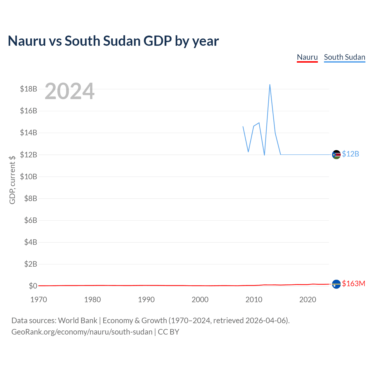 Nauru has a GDP of $163M compared to $12B for South Sudan, ranking 195/197 and 149/197 by economy size, respectively.
