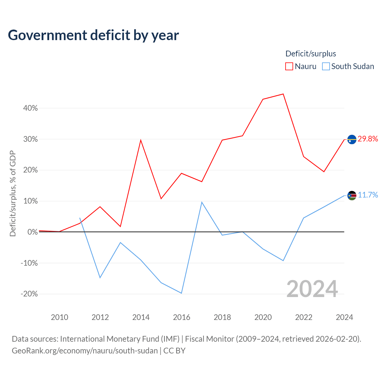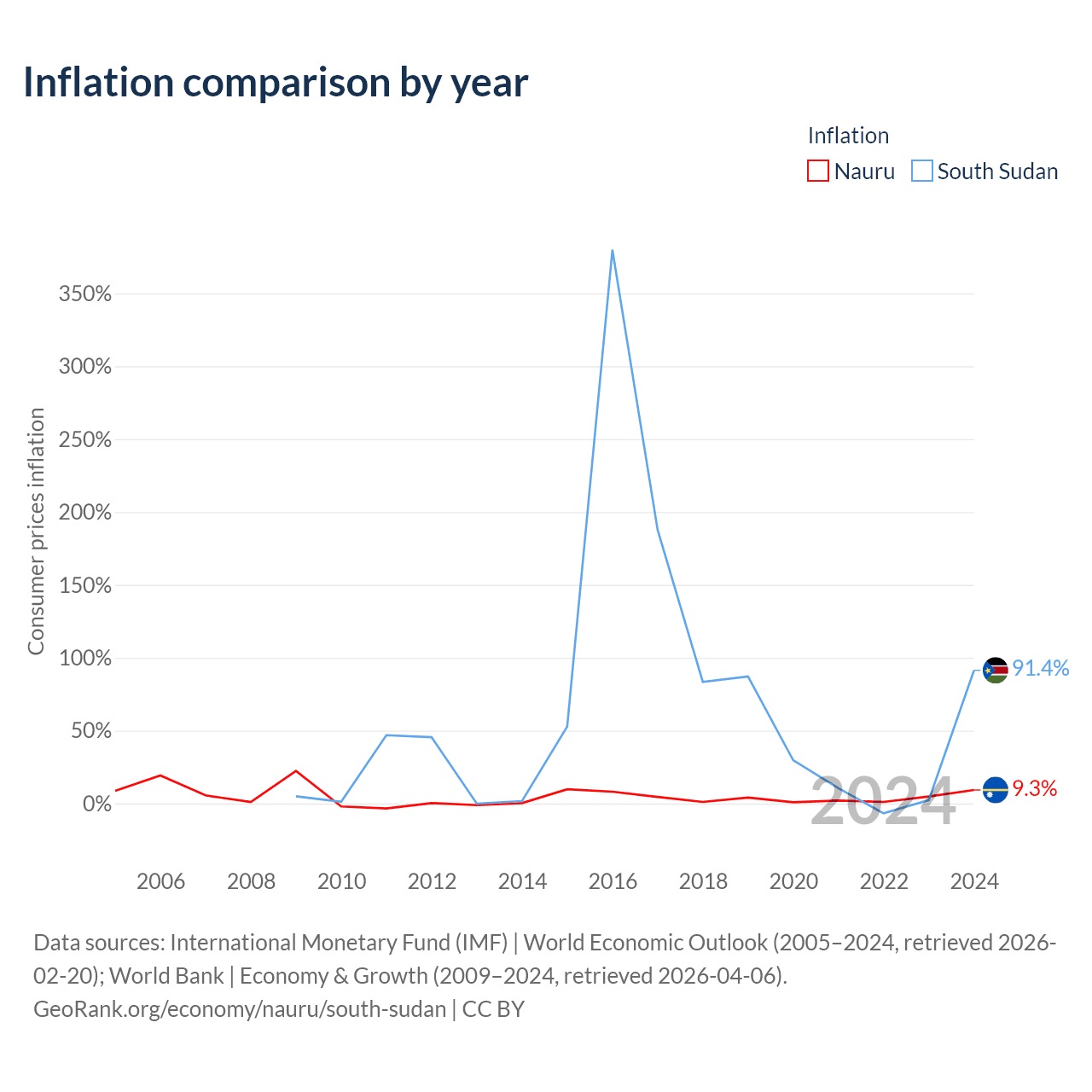 Over the past 16 years, Nauru has recorded an average annual inflation rate of 3.89%, compared with 63.7% in South Sudan. In 2024, inflation was 9.3% in Nauru and 91.4% in South Sudan.
