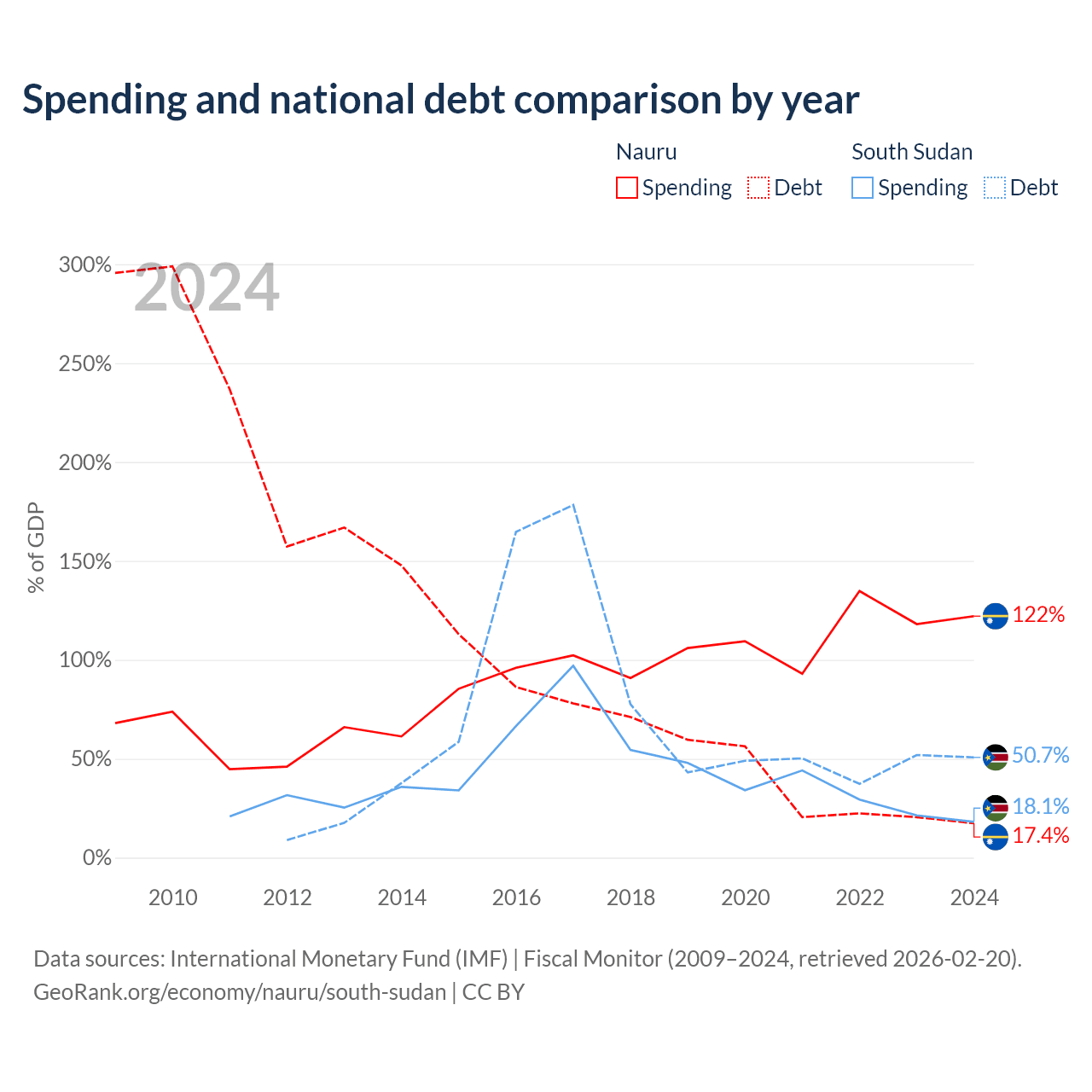 Nauru has $28.3M in government debt (17.4% of GDP), compared to $7.04B (50.7% of GDP) in South Sudan.
