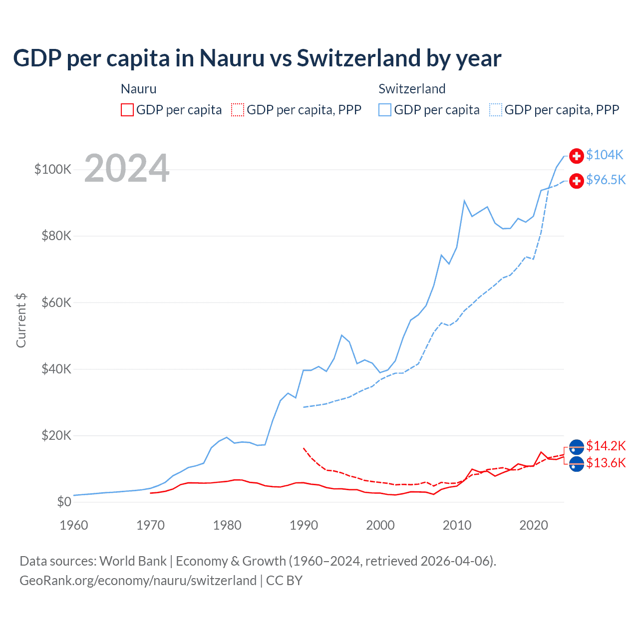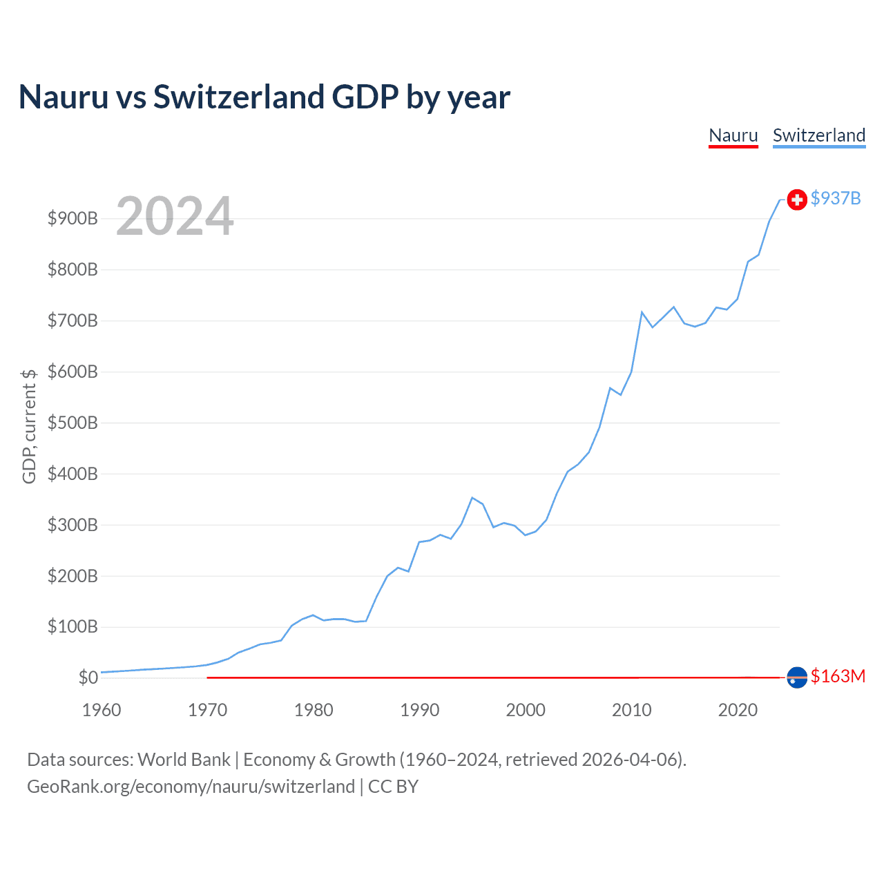 Nauru has a GDP of $163M compared to $937B for Switzerland, ranking 195/197 and 20/197 by economy size, respectively.