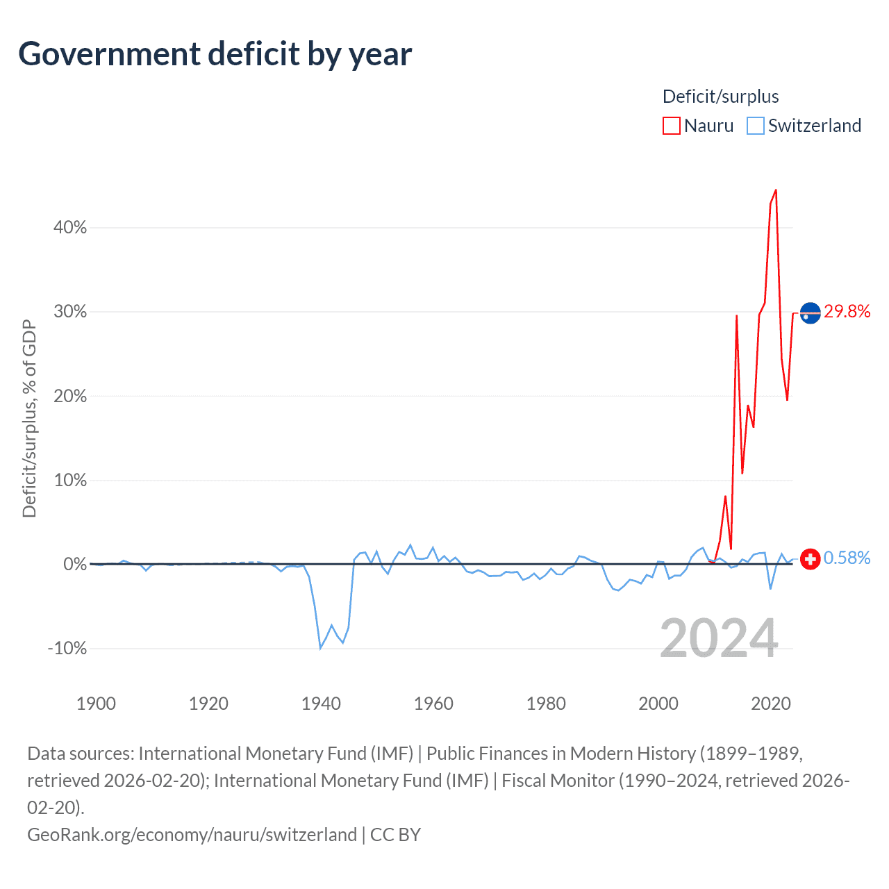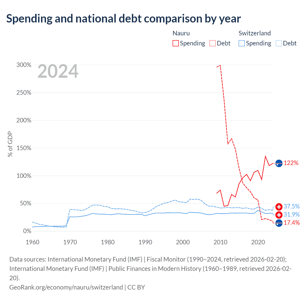 Nauru has $28.3M in government debt (17.4% of GDP), compared to $351B (37.5% of GDP) in Switzerland.