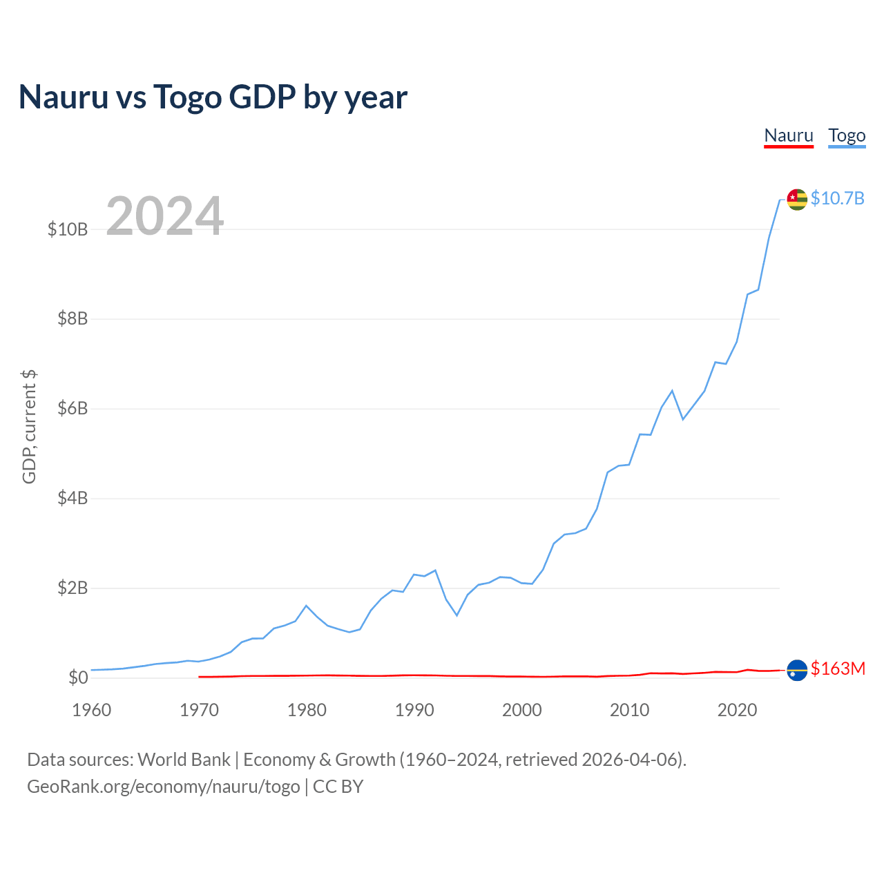 Nauru has a GDP of $163M compared to $10.7B for Togo, ranking 195/197 and 154/197 by economy size, respectively.