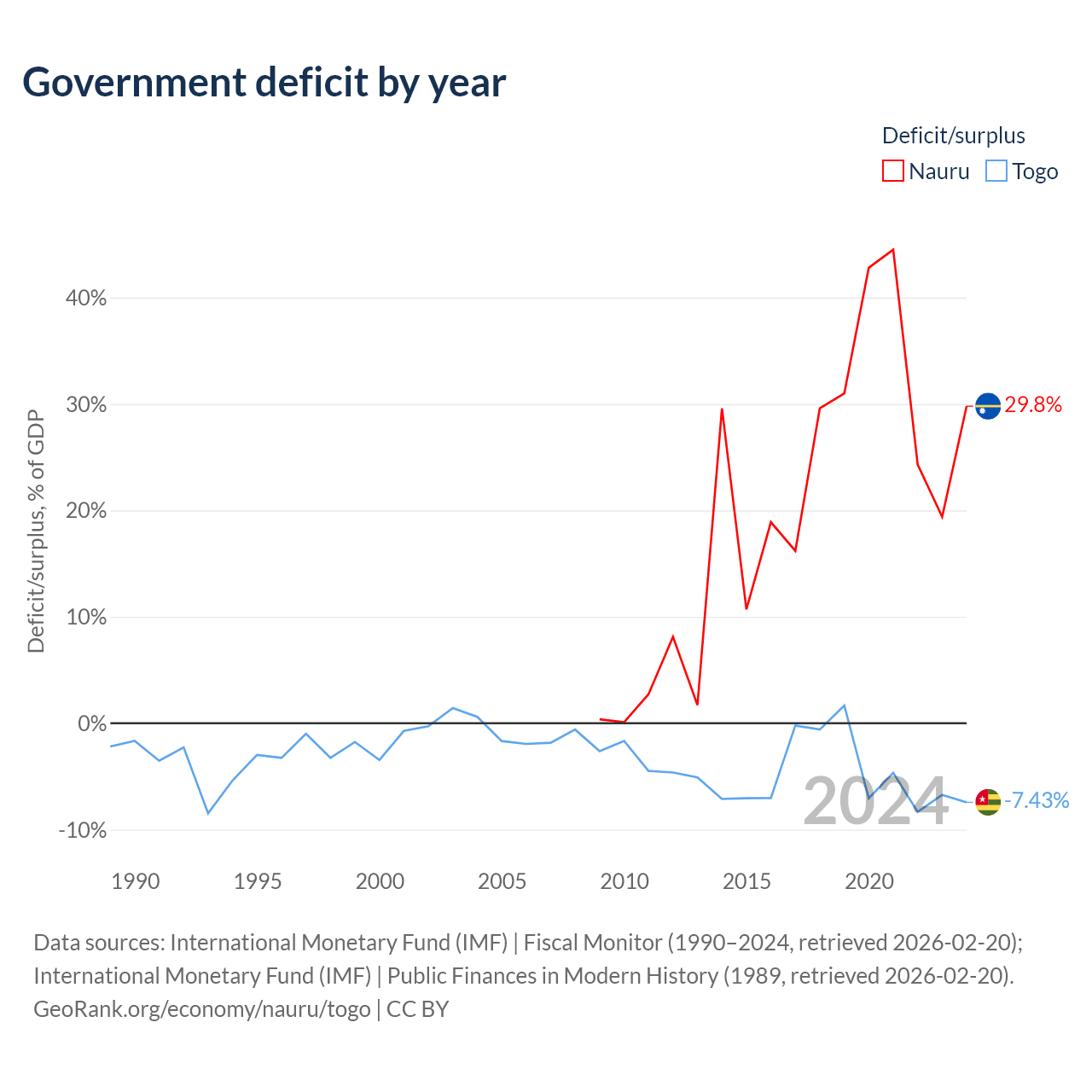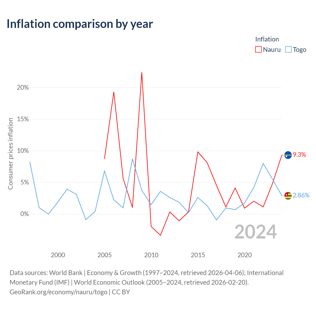 Over the past 20 years, Nauru has recorded an average annual inflation rate of 4.84%, compared with 2.93% in Togo. In 2024, inflation was 9.3% in Nauru and 2.86% in Togo.