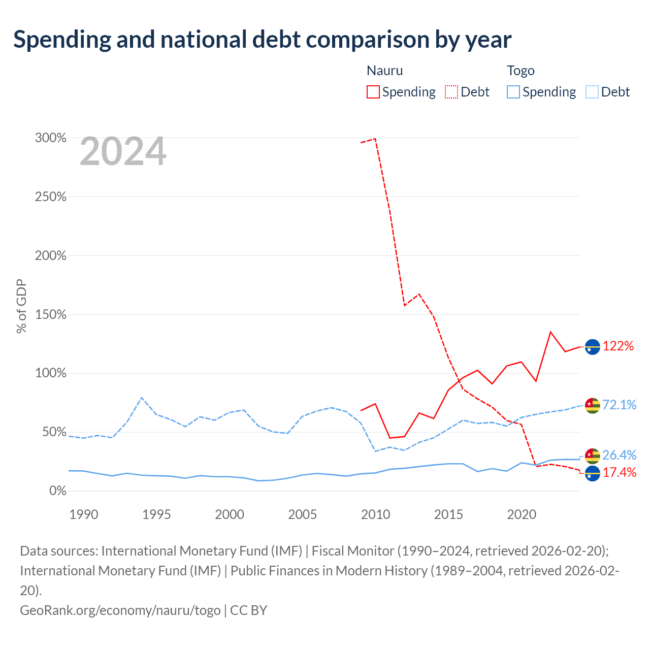 Nauru has $28.3M in government debt (17.4% of GDP), compared to $7.68B (72.1% of GDP) in Togo.