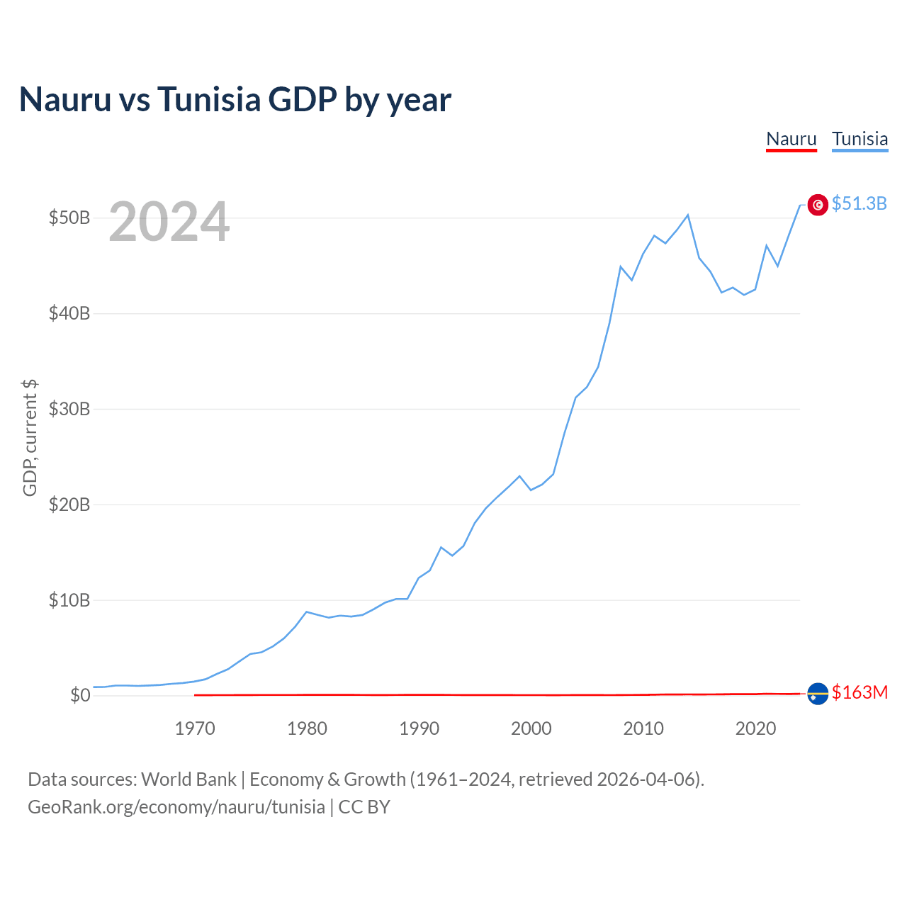 Nauru has a GDP of $163M compared to $51.3B for Tunisia, ranking 195/197 and 93/197 by economy size, respectively.