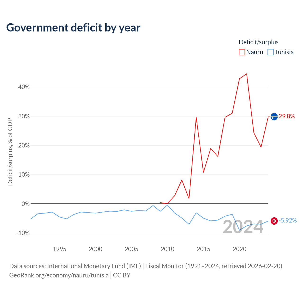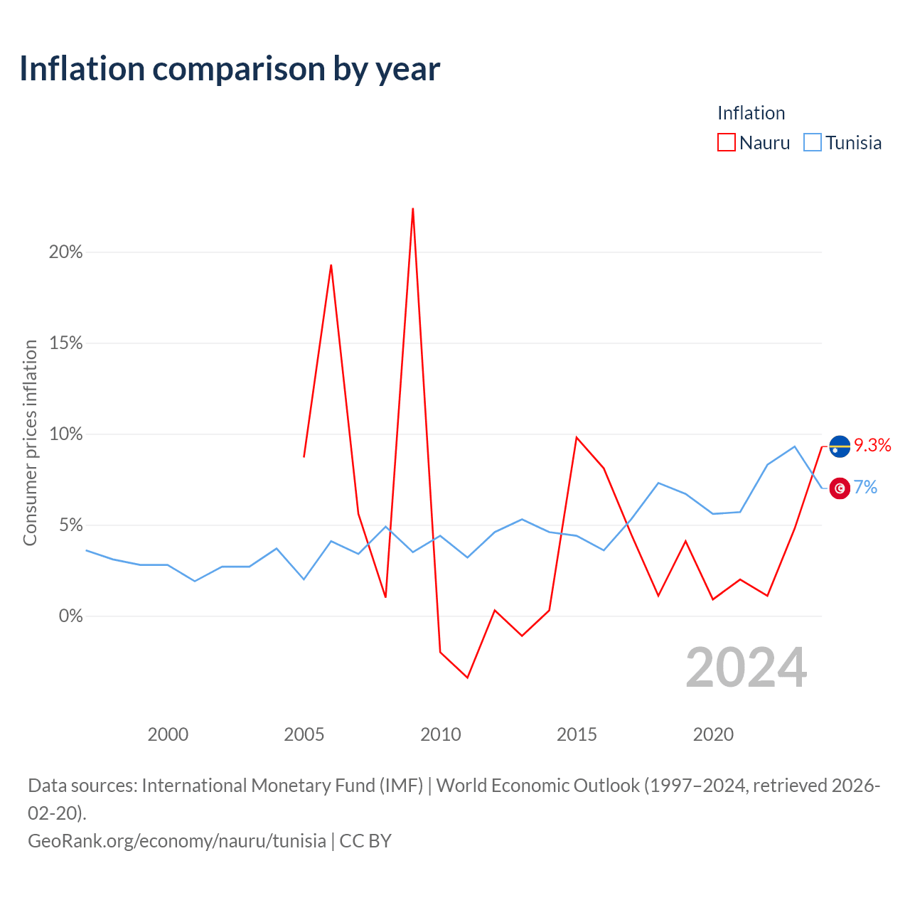 Over the past 20 years, Nauru has recorded an average annual inflation rate of 4.84%, compared with 5.16% in Tunisia. In 2024, inflation was 9.3% in Nauru and 7% in Tunisia.