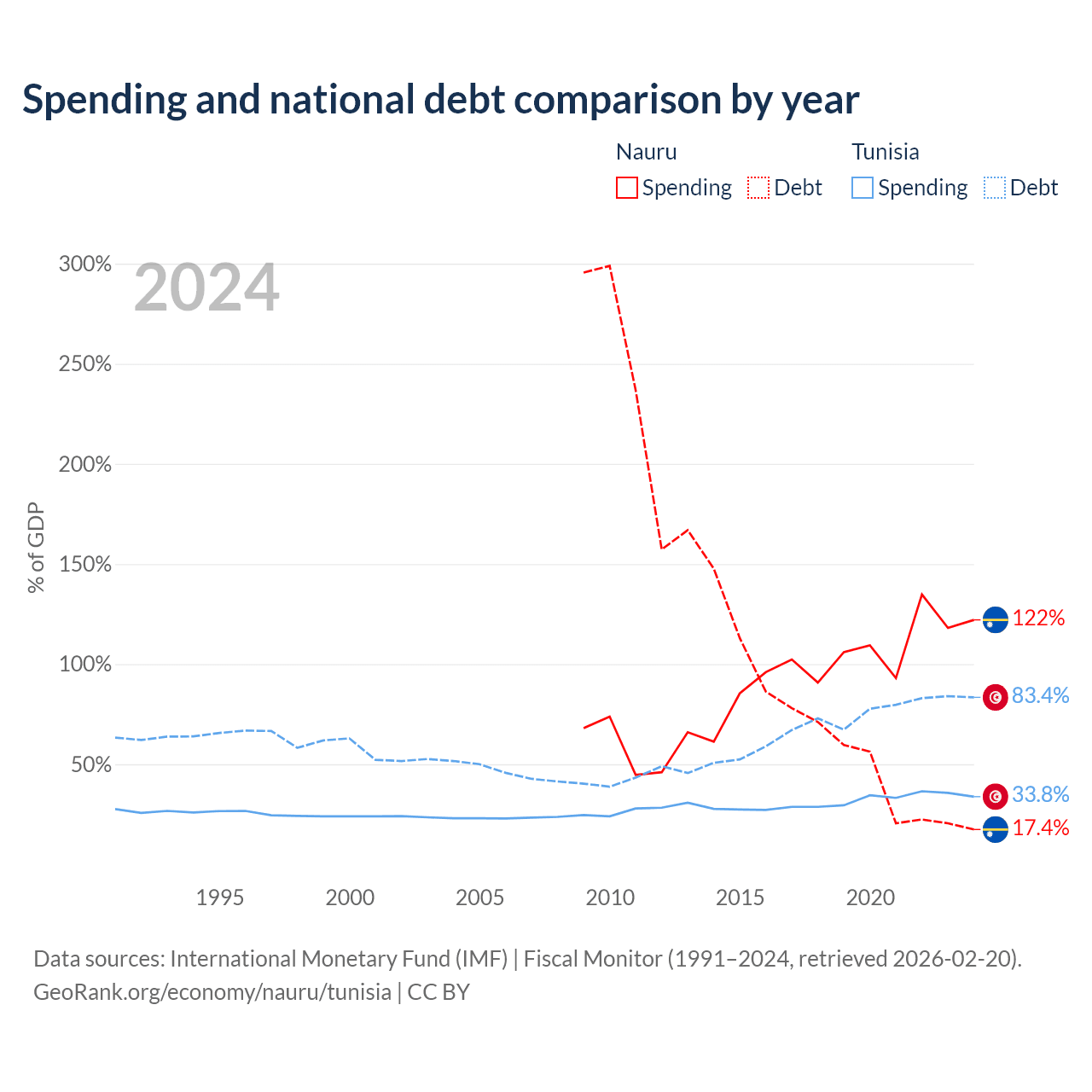 Nauru has $28.3M in government debt (17.4% of GDP), compared to $42.8B (83.4% of GDP) in Tunisia.