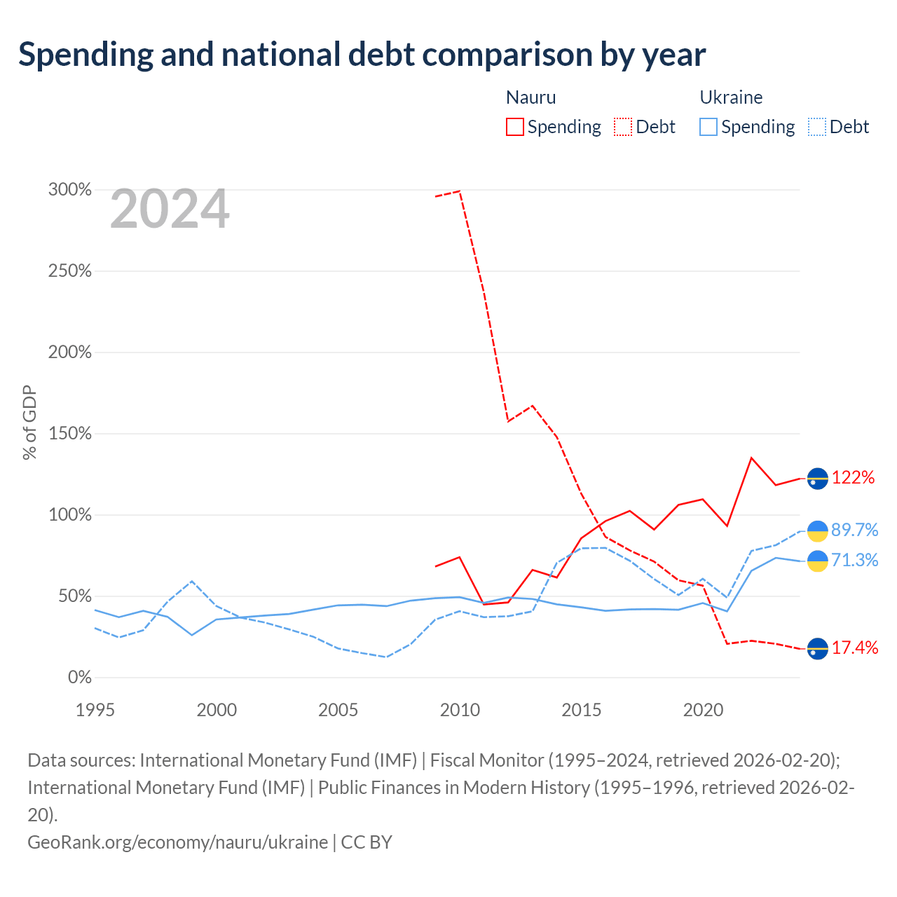 Nauru has $28.3M in government debt (17.4% of GDP), compared to $171B (89.7% of GDP) in Ukraine.