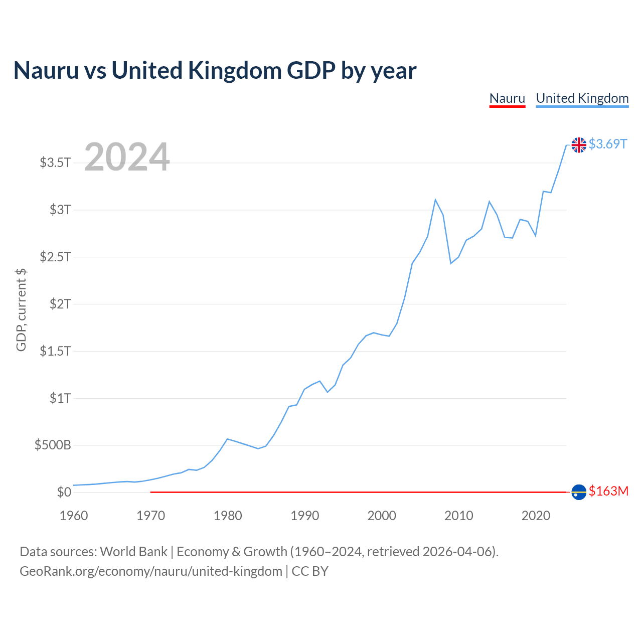 Nauru has a GDP of $163M compared to $3.69T for the United Kingdom, ranking 195/197 and 6/197 by economy size, respectively.