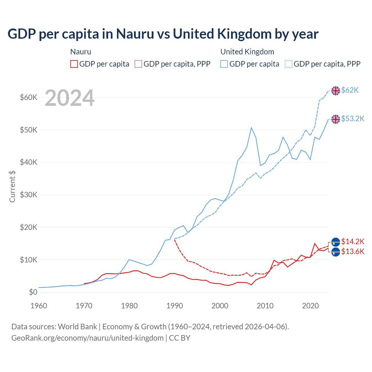 GDP per capita in Nauru vs United Kingdom by year