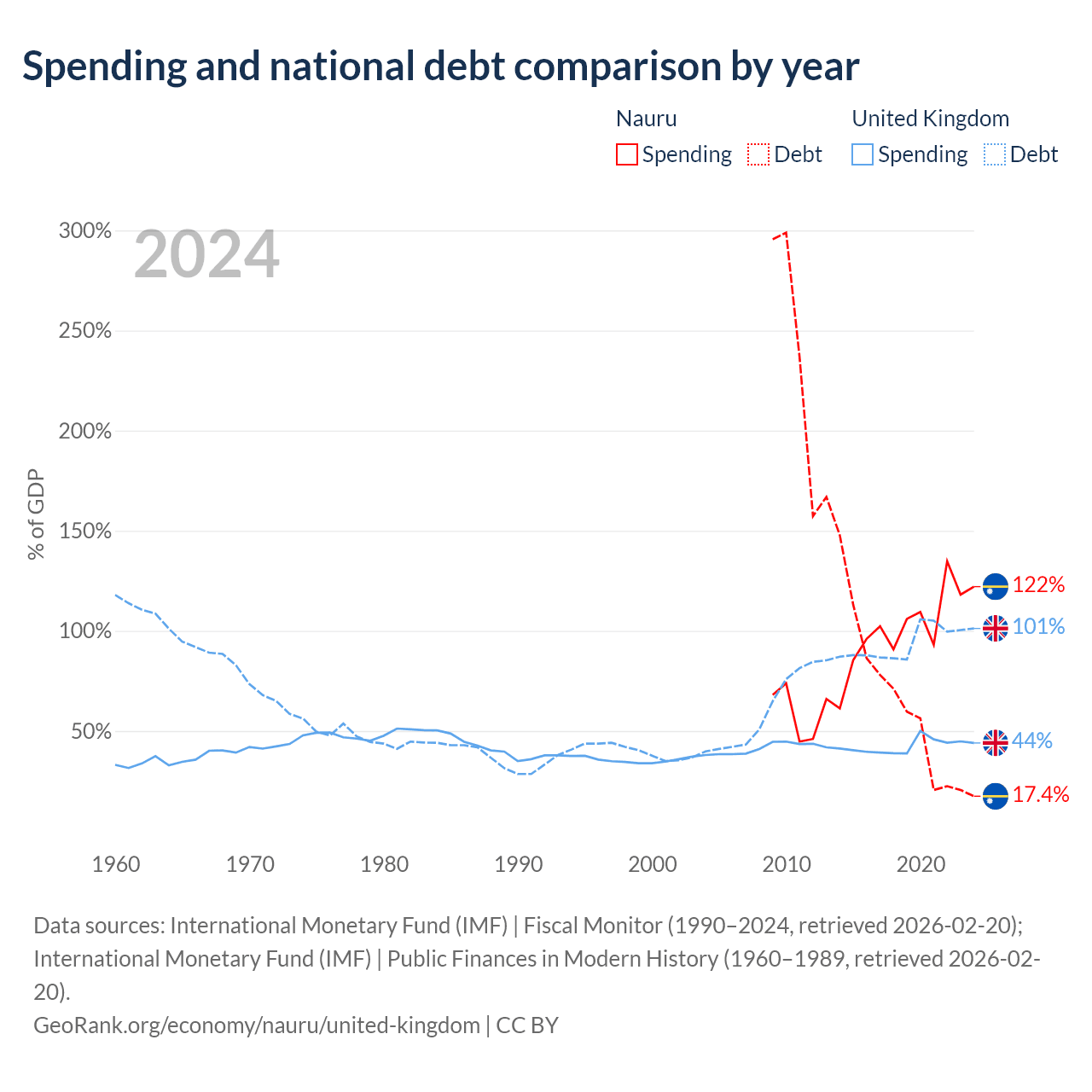 Nauru has $28.3M in government debt (17.4% of GDP), compared to $3.73T (101.2% of GDP) in the United Kingdom.