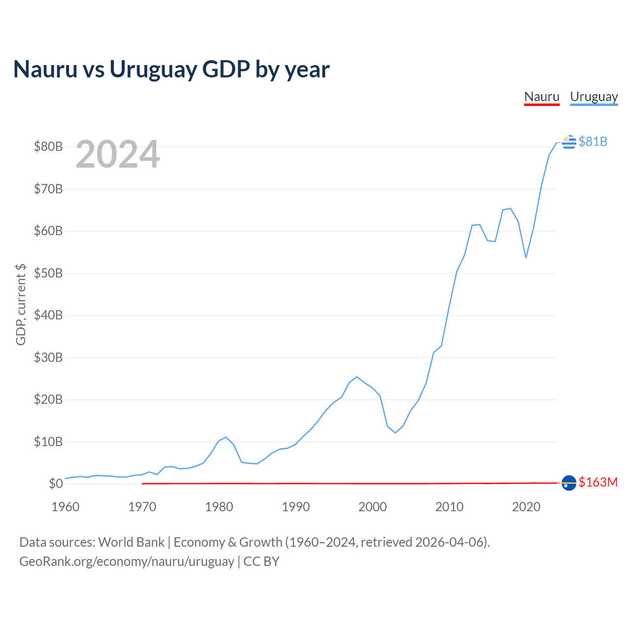 Nauru has a GDP of $163M compared to $81B for Uruguay, ranking 195/197 and 81/197 by economy size, respectively.