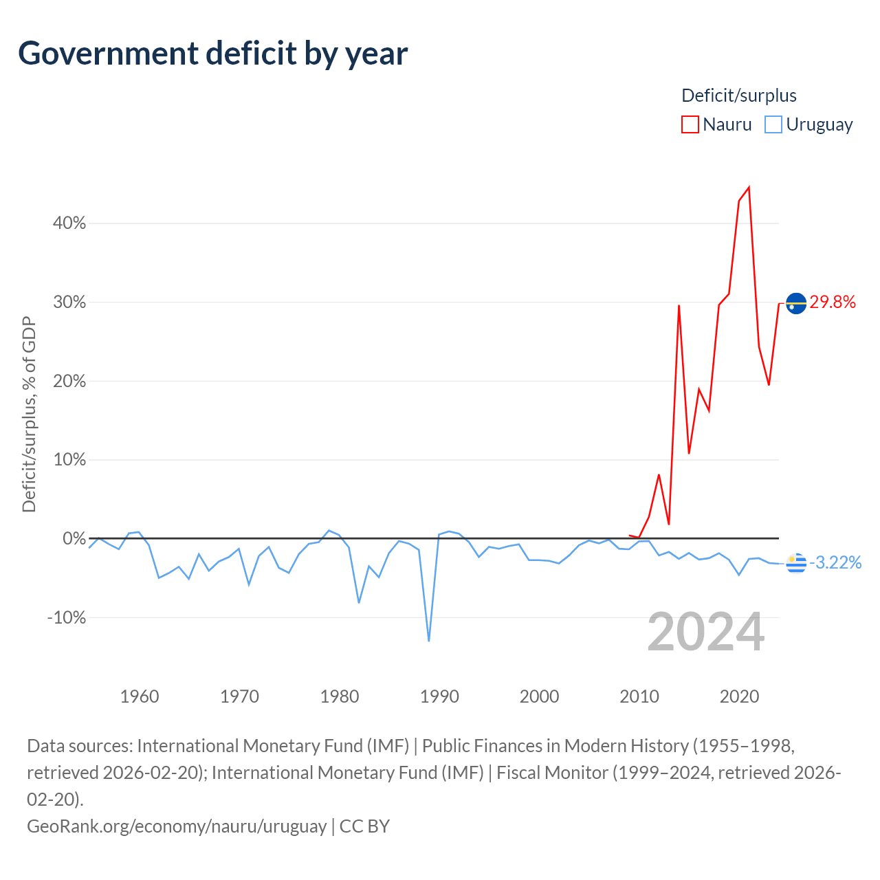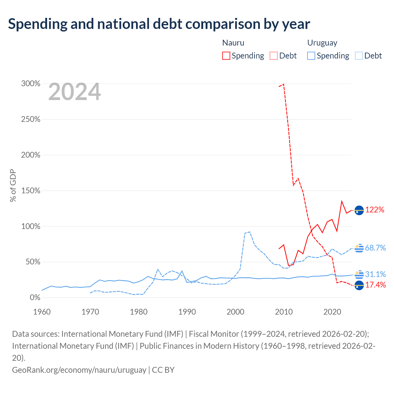 Nauru has $28.3M in government debt (17.4% of GDP), compared to $55.6B (68.7% of GDP) in Uruguay.