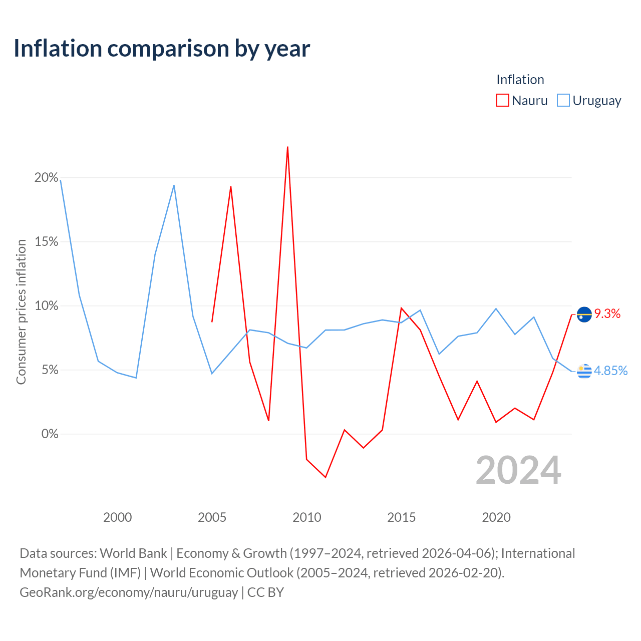 Over the past 20 years, Nauru has recorded an average annual inflation rate of 4.84%, compared with 7.59% in Uruguay. In 2024, inflation was 9.3% in Nauru and 4.85% in Uruguay.