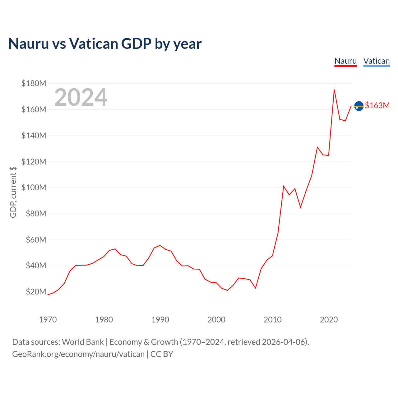 Nauru has a GDP of $163M compared to $19.8M for the Vatican, ranking 195/197 and 197/197 by economy size, respectively.