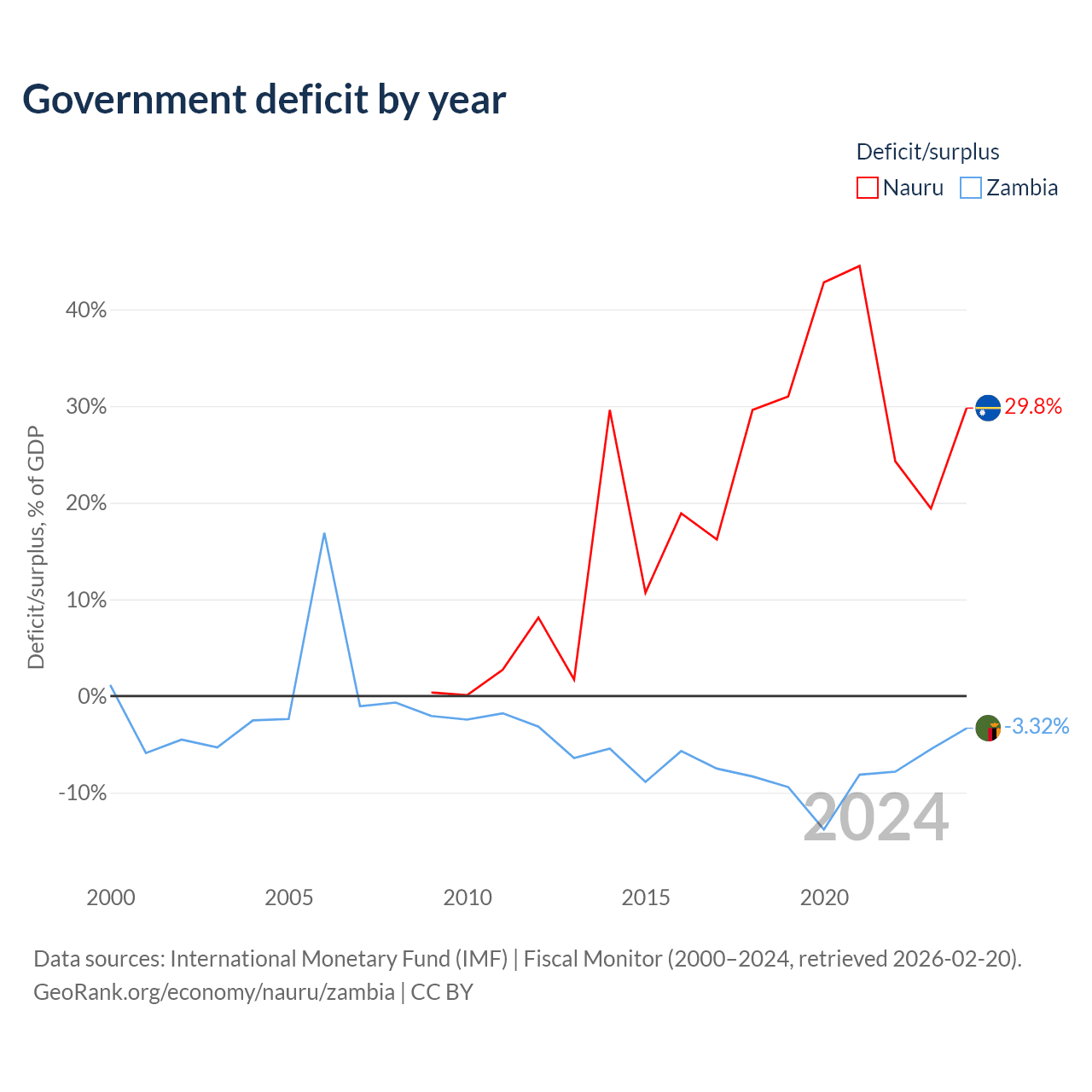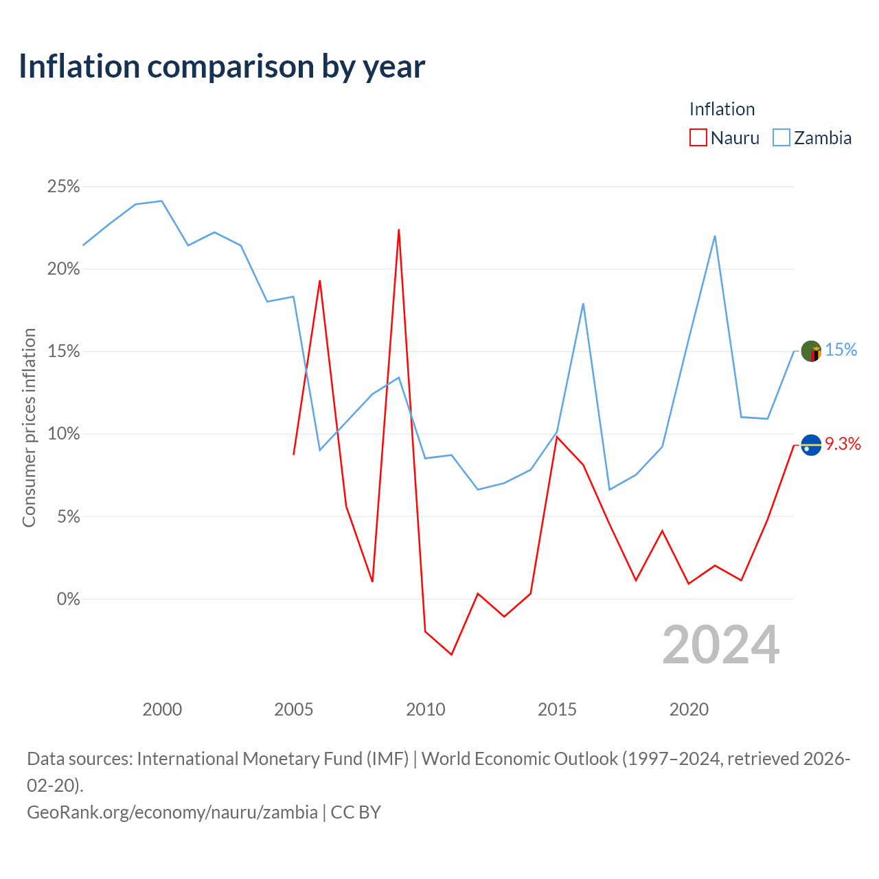 Over the past 20 years, Nauru has recorded an average annual inflation rate of 4.84%, compared with 11.4% in Zambia. In 2024, inflation was 9.3% in Nauru and 15% in Zambia.