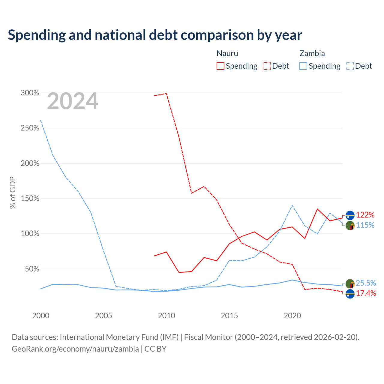Nauru has $28.3M in government debt (17.4% of GDP), compared to $29.1B (114.9% of GDP) in Zambia.