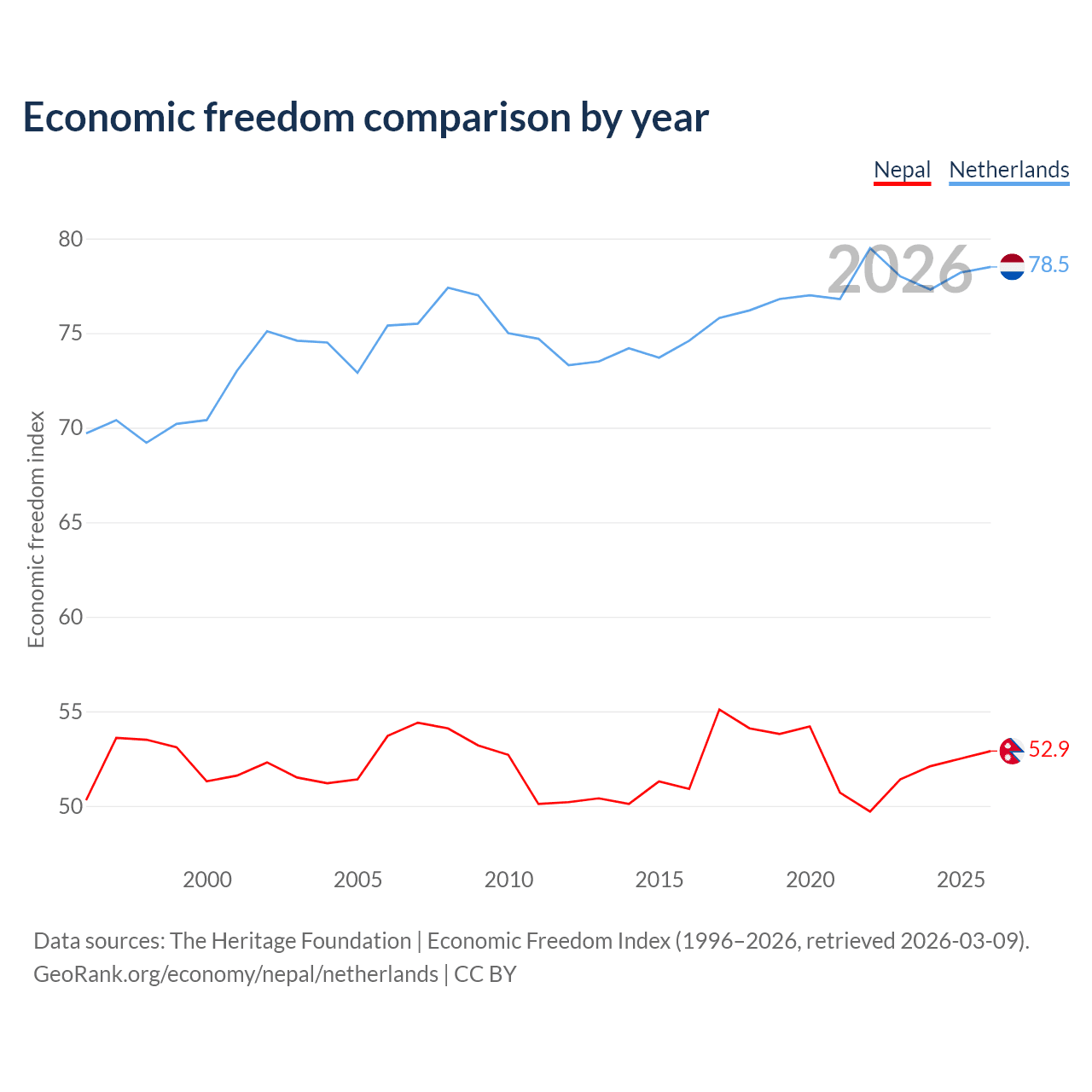 The Economic Freedom Index for Nepal is 52.9, ranking 144/197, compared to 78.5 for the Netherlands, ranking 11/197. The chart above displays a comparison of annual changes in economic freedom indexes.