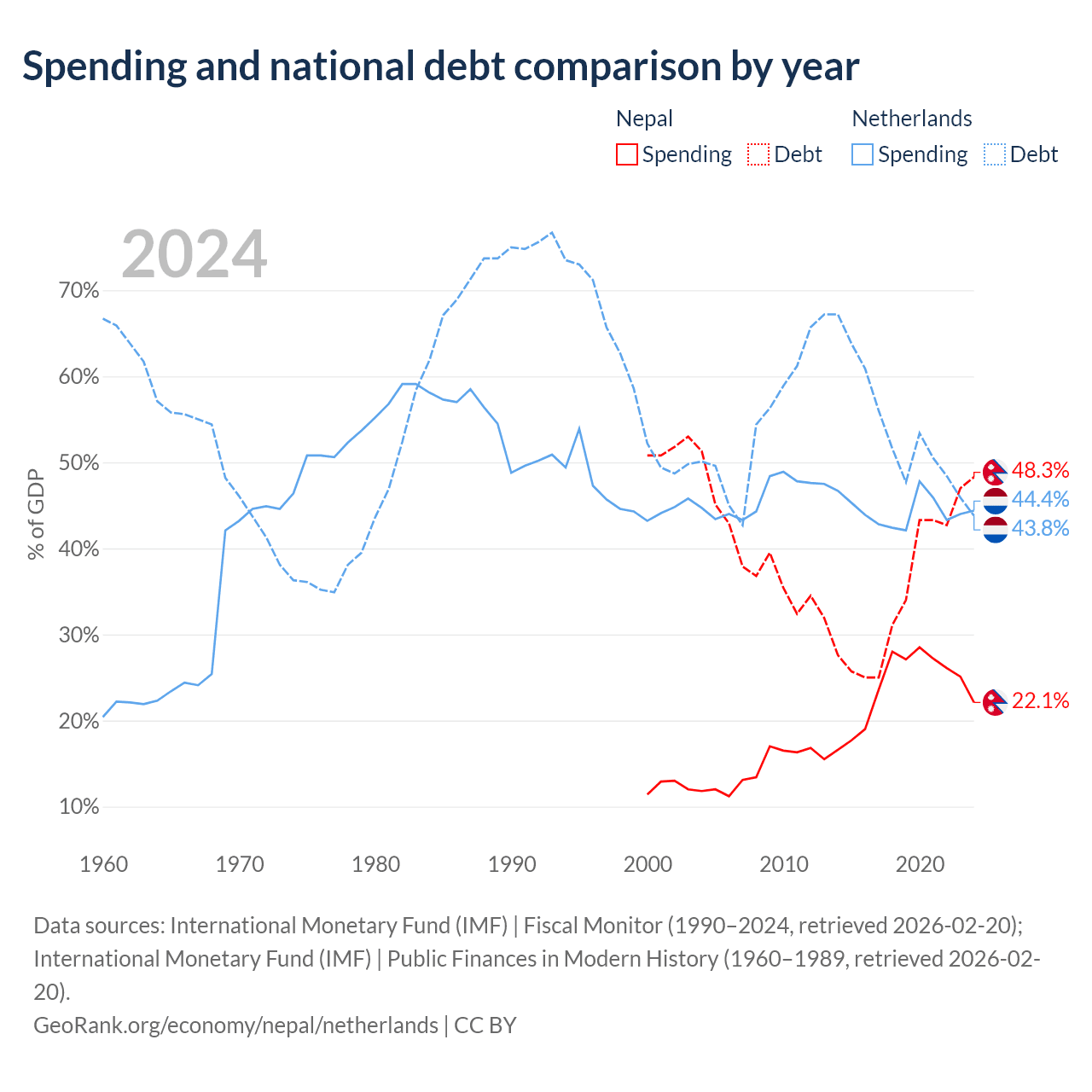 Nepal has $20.7B in government debt (48.3% of GDP), compared to $532B (43.8% of GDP) in the Netherlands.